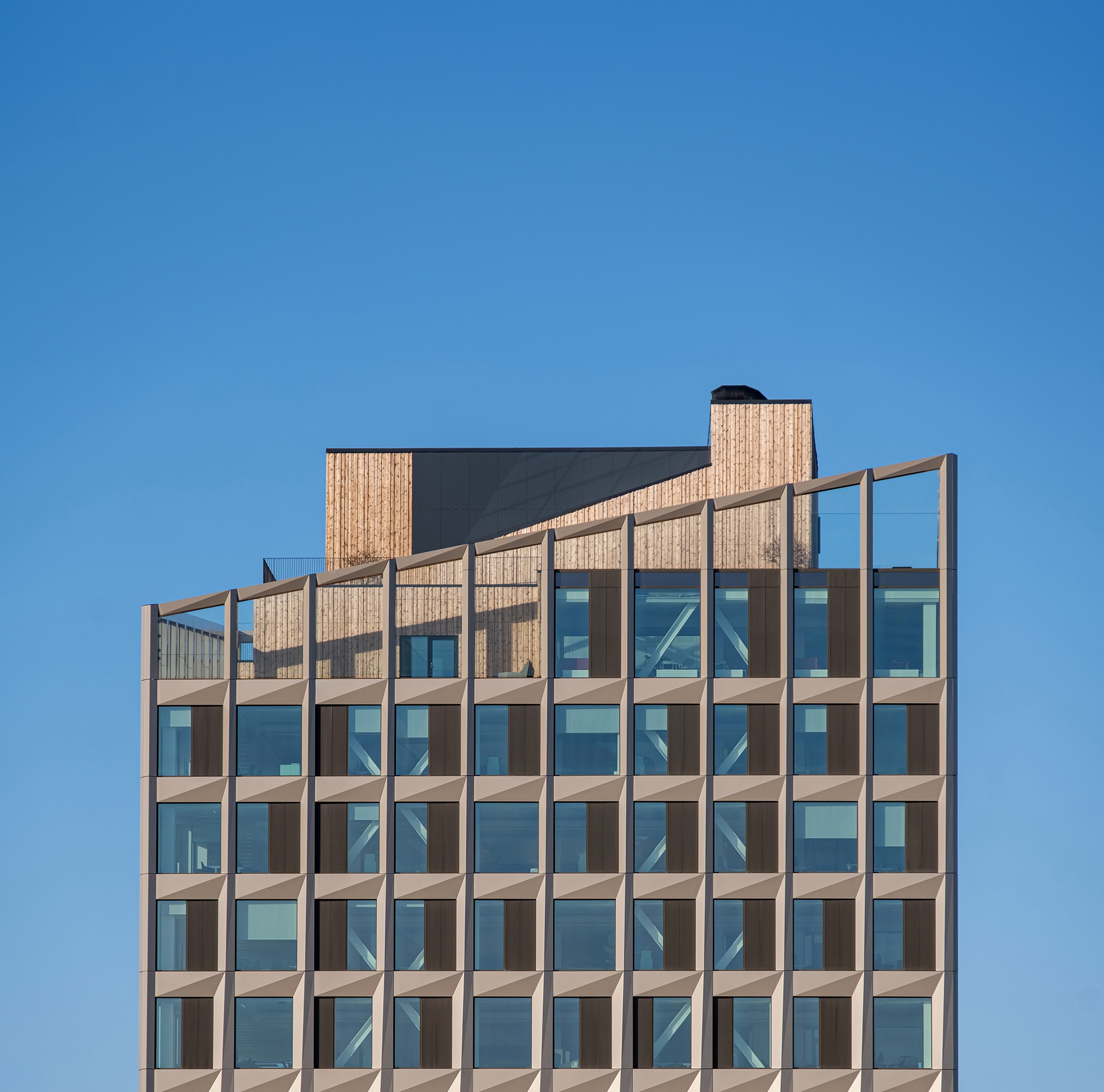 The nine-story city hall stands as a visually striking landmark, featuring a champagne-coloured, angled façade and a transparent atrium. Its inviting public spaces, including a rooftop terrace open to the public and landscaped surroundings, connect seamlessly with the nearby park and urban area. Flexible interiors optimise daylight and air quality, ensuring a healthy and adaptable work environment. To future-proof the office areas, the design is flexible, so it can be easily adapted and reconfigured for new needs and work methods. Sustainable features like recycled concrete foundations, intelligent energy systems, and biodiversity-focused landscaping have earned the building a DGNB Gold certification, setting a new standard for civic architecture.