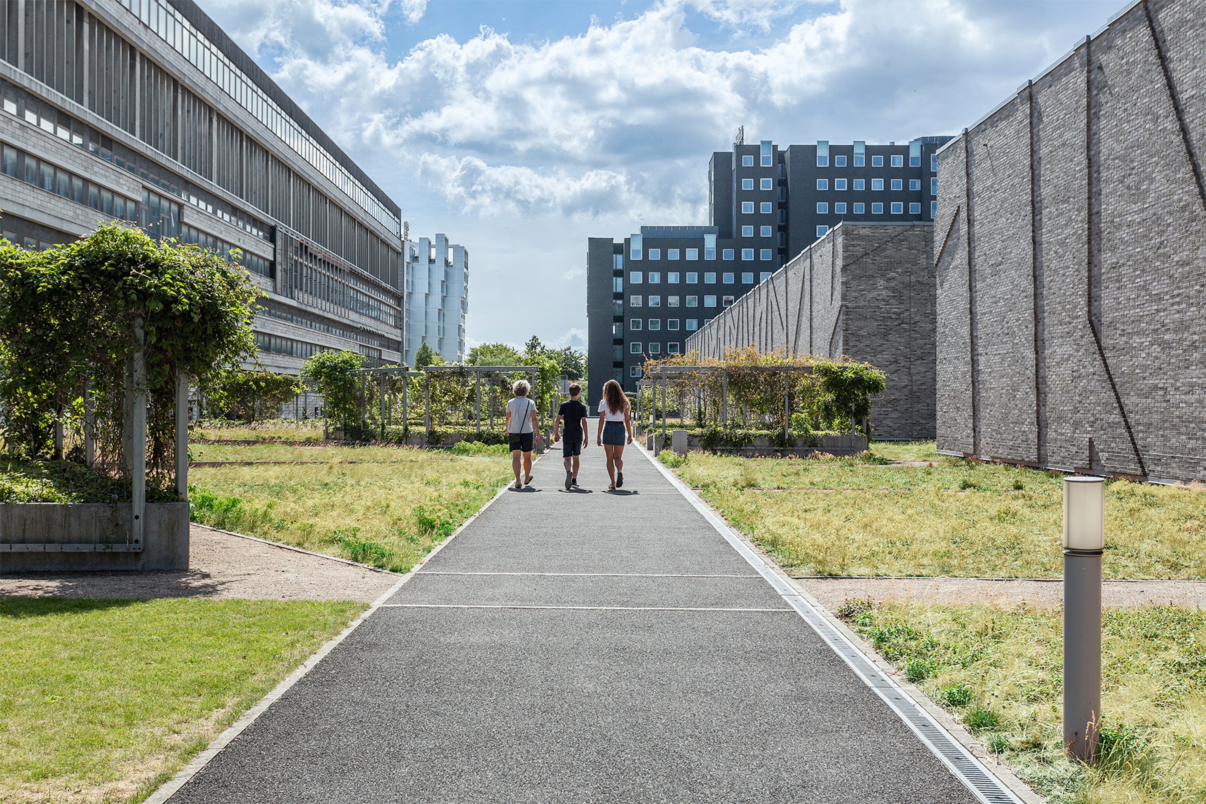 We designed two interconnected, windowless archive towers complemented by a low linking structure that houses a rooftop garden, the "green promenade." This public space not only enriches the urban fabric but also plays a crucial role in climate regulation, rainwater harvesting, and insulation. The unique façade pattern animates the brick surfaces, creating shifting plays of light and shadow, while internally, the same patterns connect spaces.