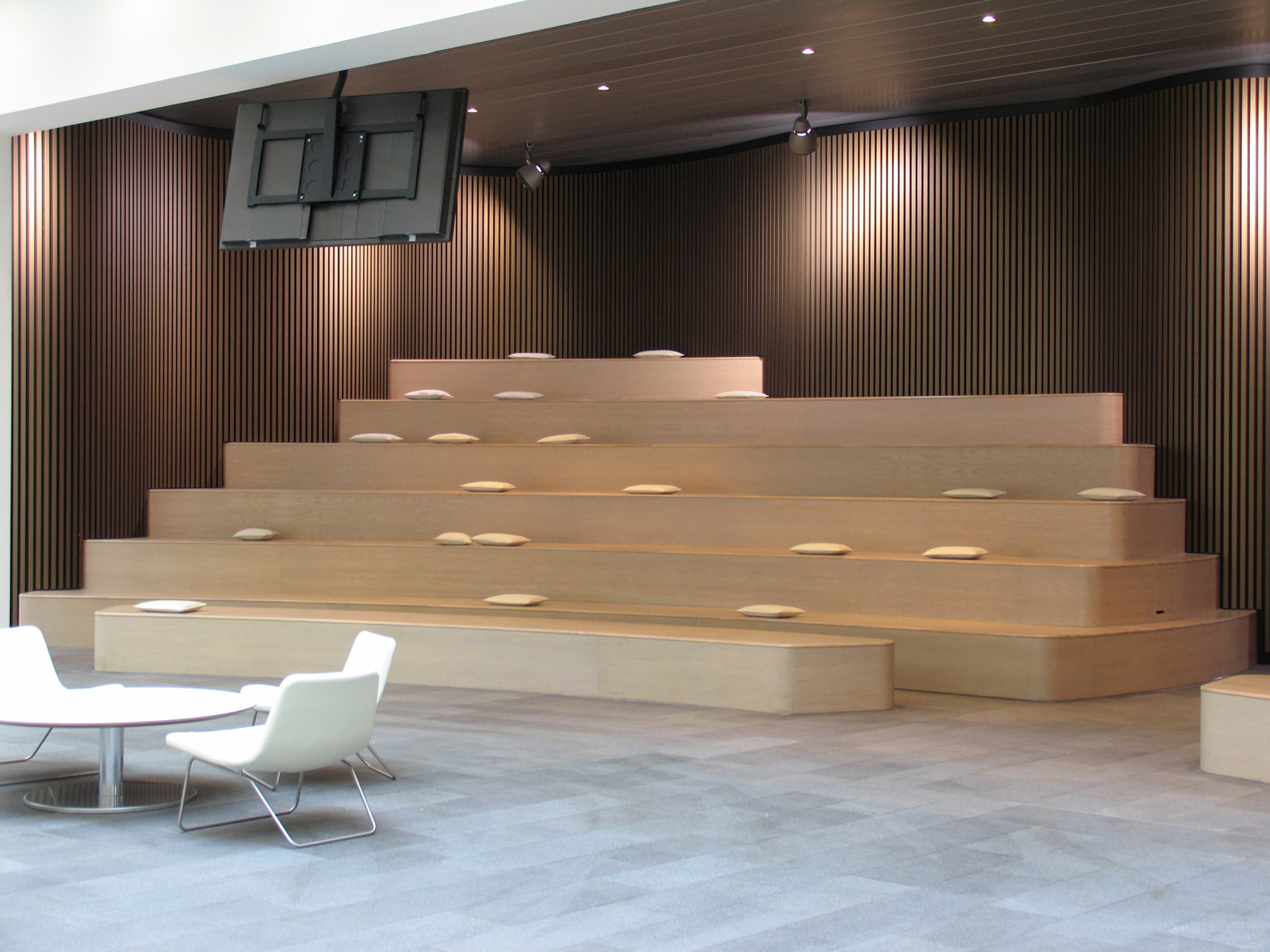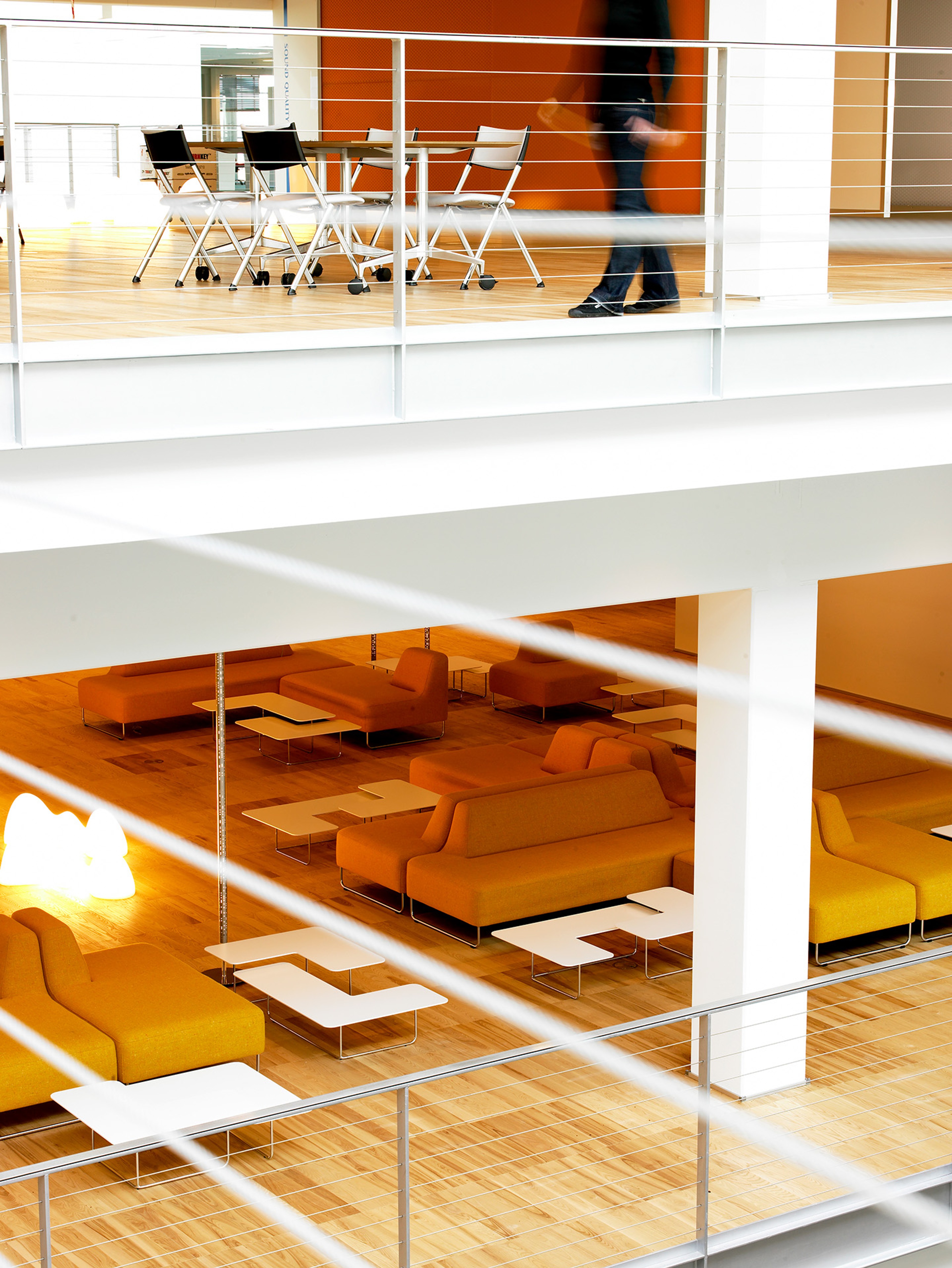 The existing structure was extensively reconfigured to improve functionality, acoustics, and connectivity. A new, more prominent entrance, open atriums, and fluid connections between spaces foster interaction. The workspace offers diverse settings – from open offices and innovation hubs to lounges, cafés, and dedicated project zones – designed to inspire creative thinking. A distinct wayfinding system, drawing inspiration from continents, cities, and destinations, enhances navigation and spatial identity.
