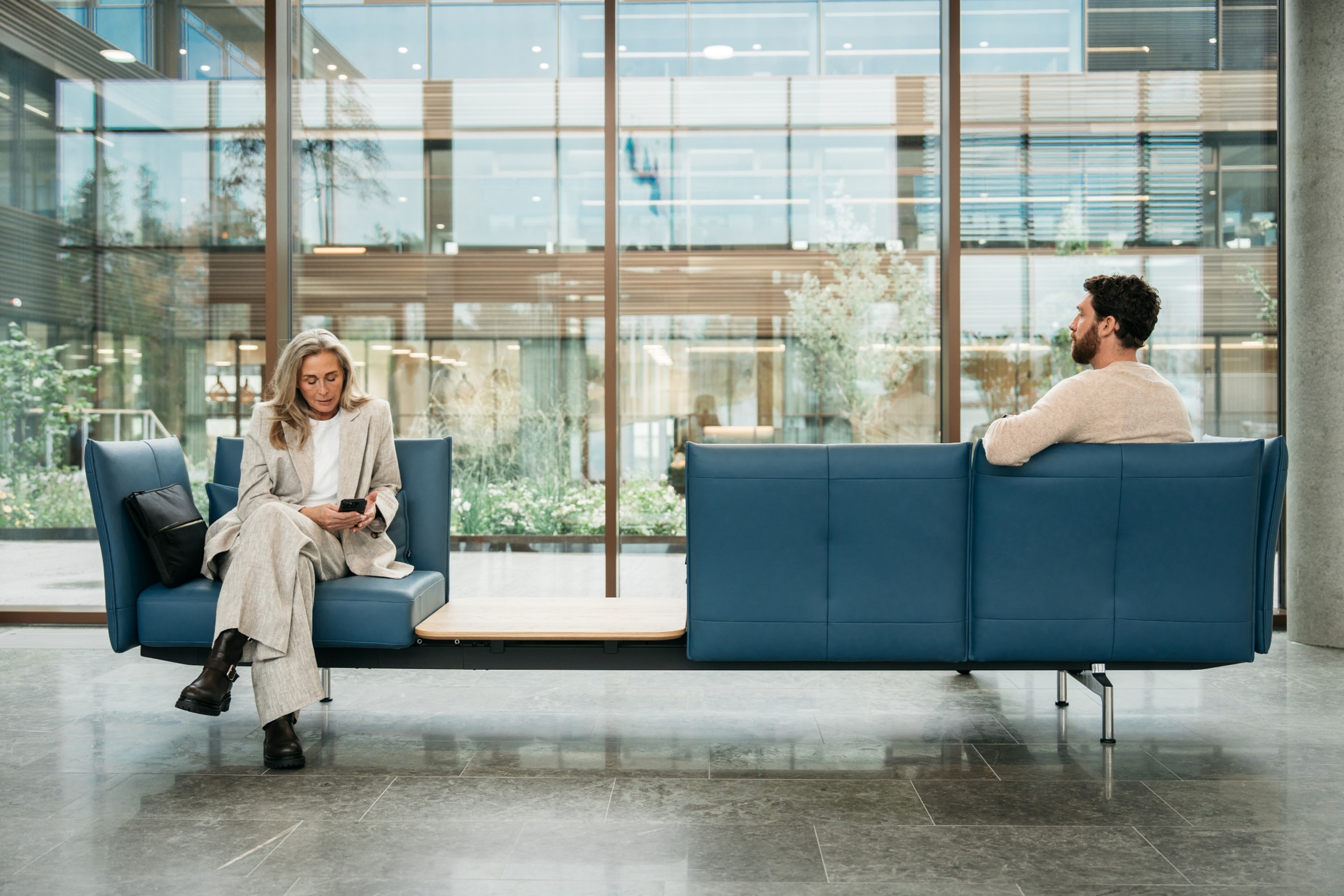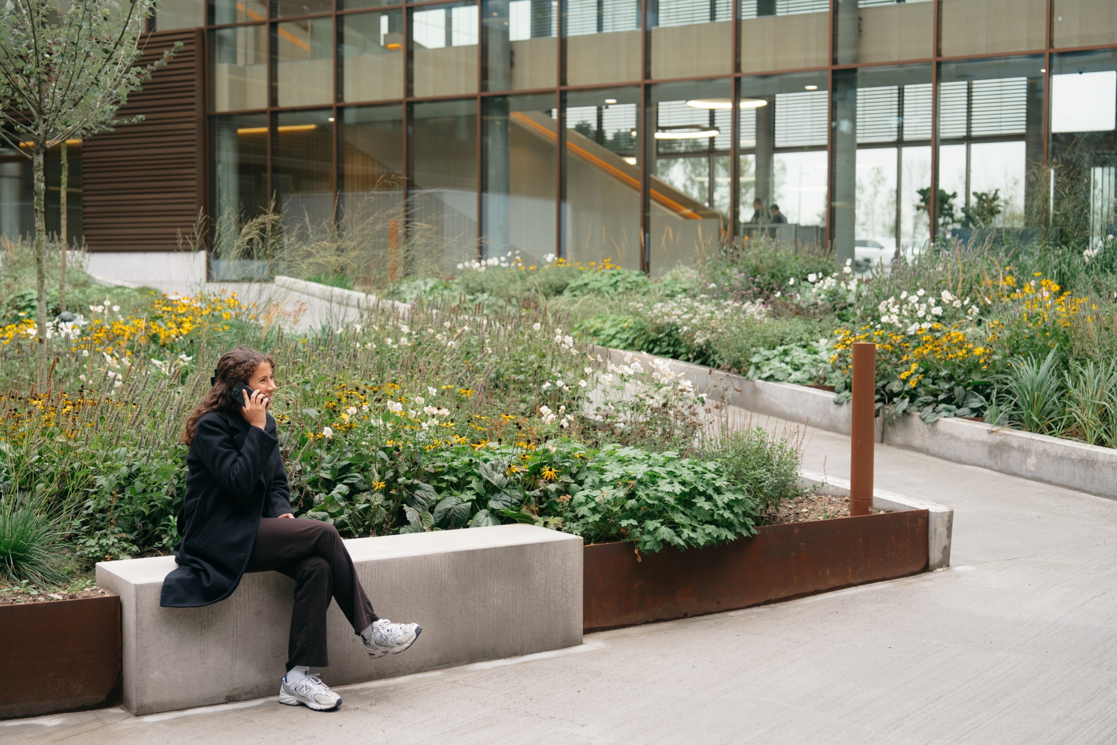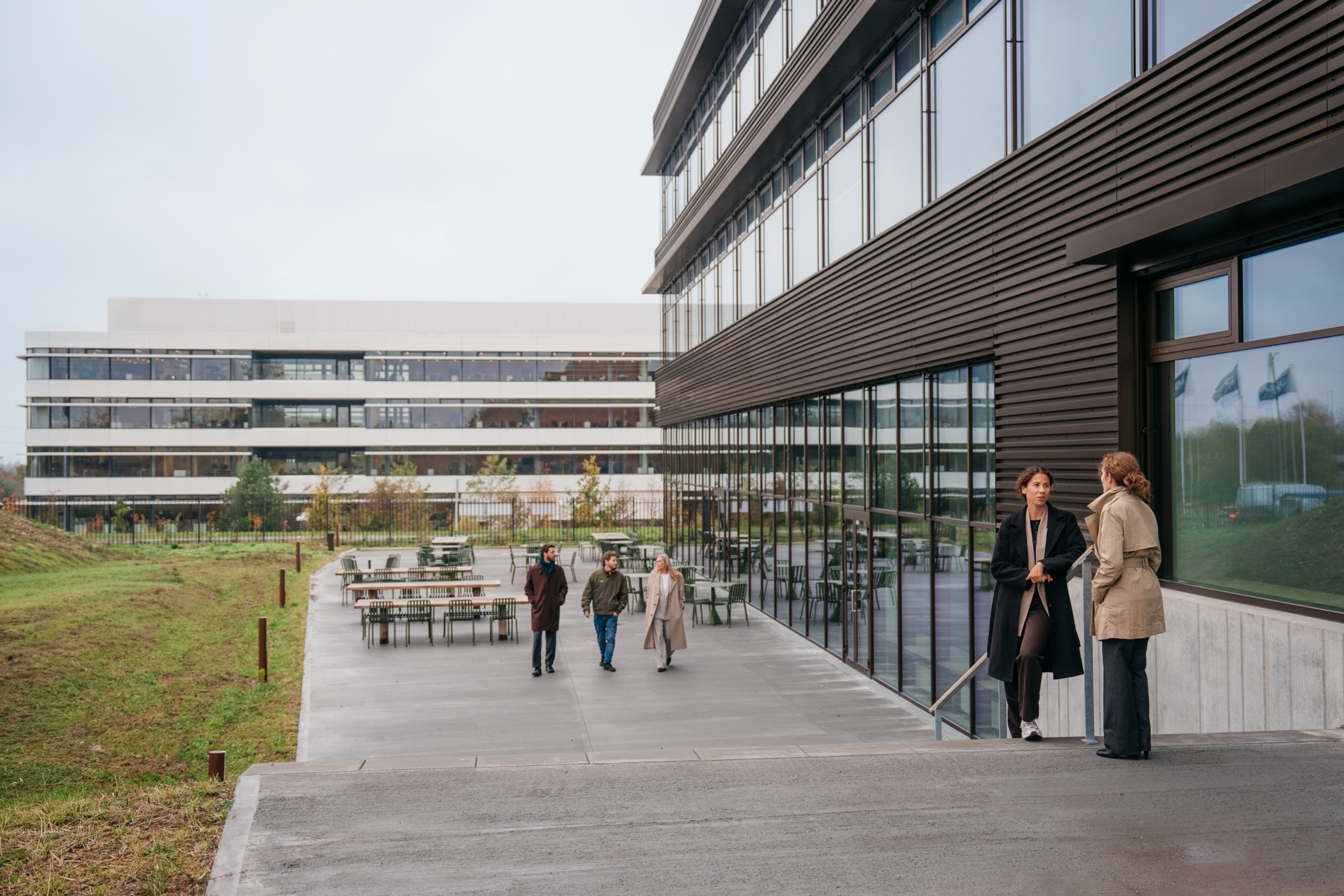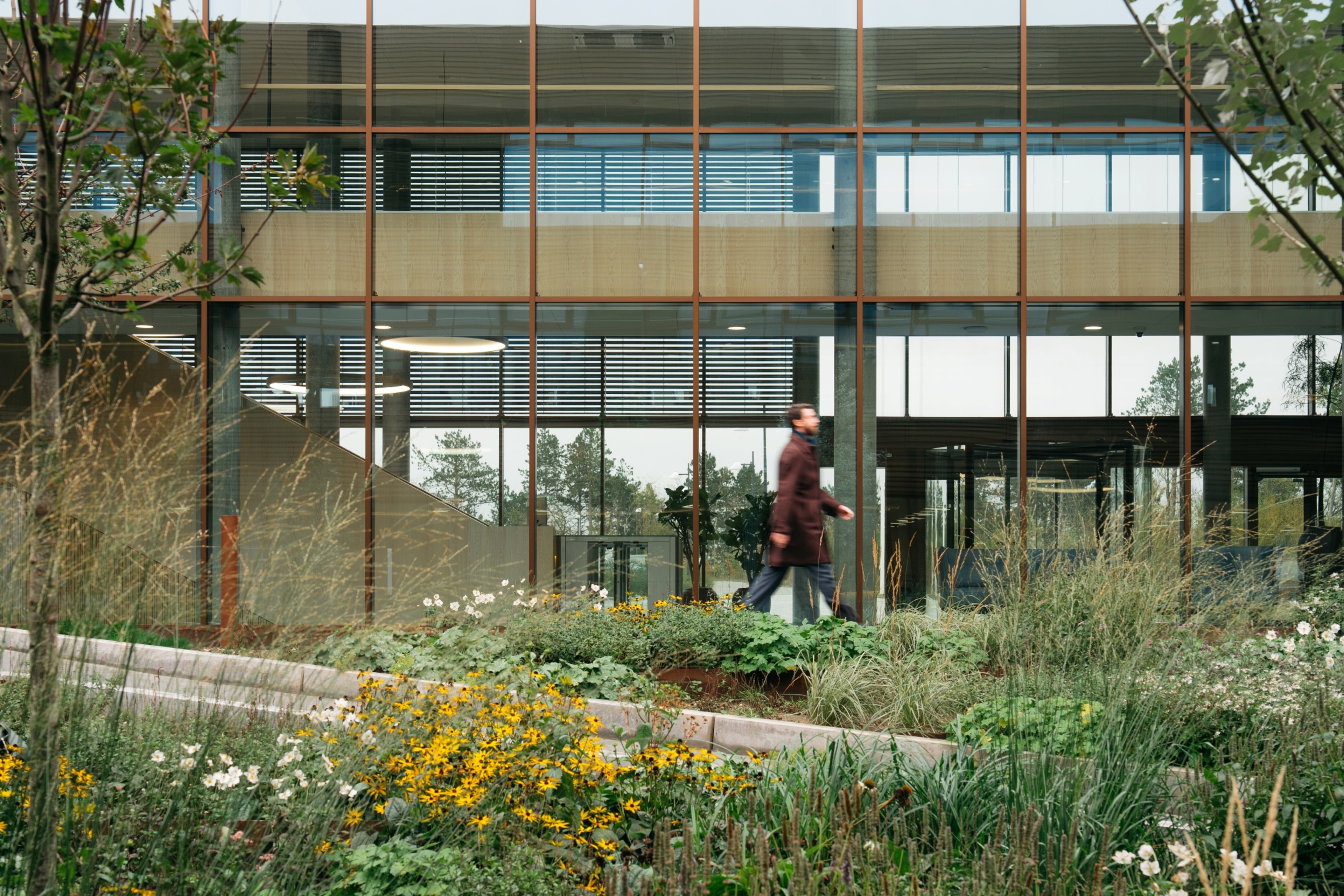 The location of HQ3 on a hilltop has required careful adaptation to the terrain and the creation of an arrival experience that feels natural and welcoming. A newly built road winds its way through the undulating landscape, gently guiding employees and visitors toward the newly established parking facilities. The simple, horizontal lines of the architecture give the structure a sense of lightness and anchor it in the landscape, while the view across the open countryside becomes an integral part of the working day.