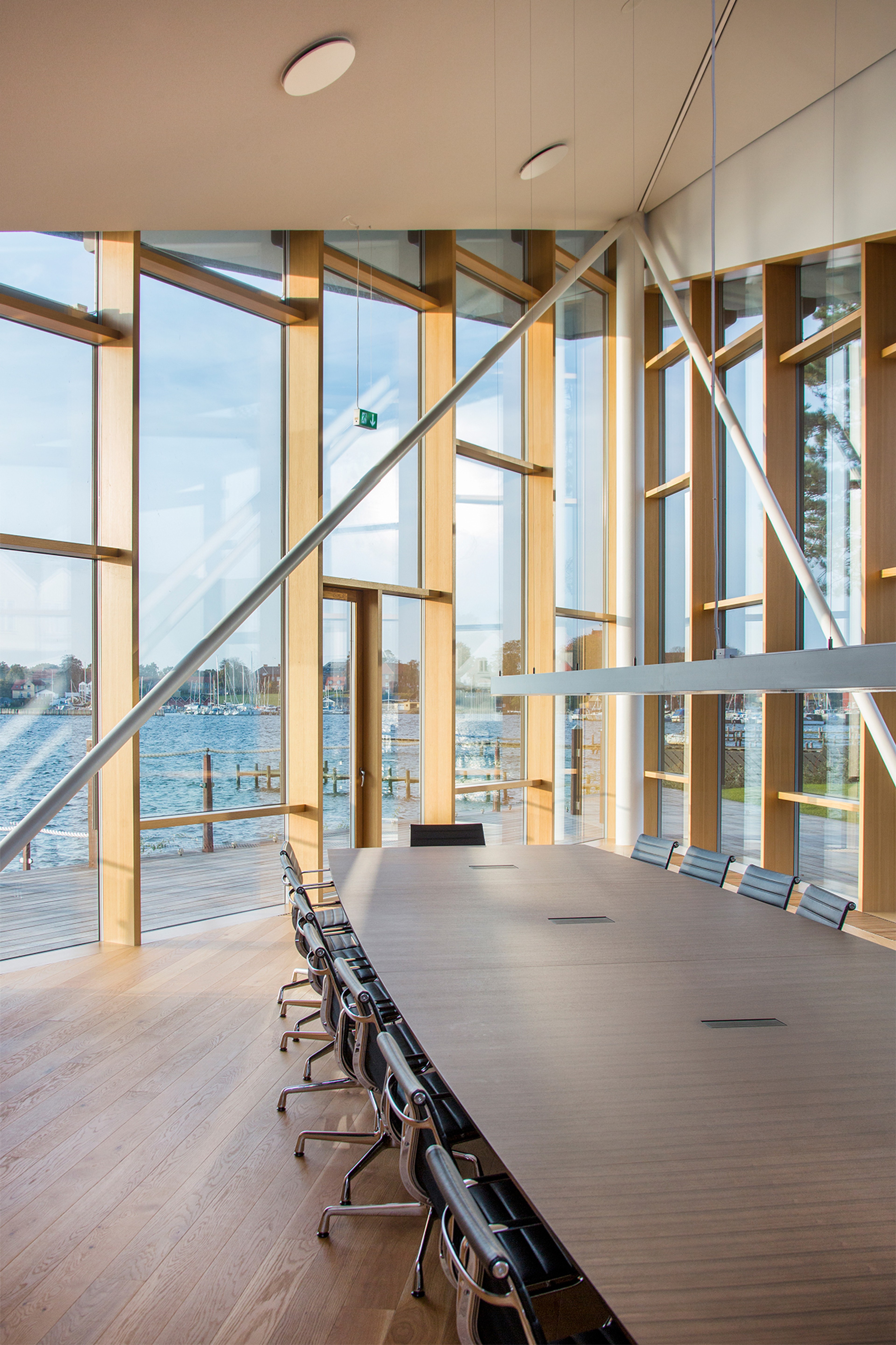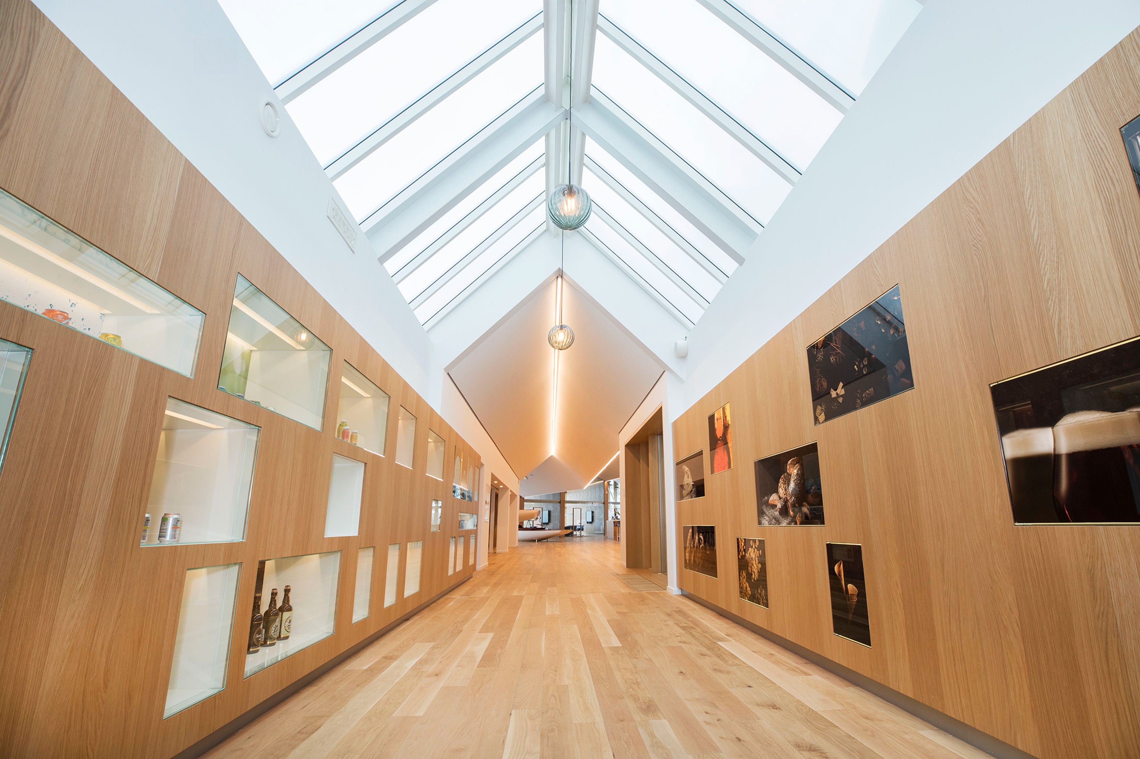 The visitor center consolidates reception, offices, an auditorium, and exhibition areas under a striking roofline that mirrors the fjord's movement. The façade facing the water creates a dynamic link between the existing industrial buildings and the harbour, offering an inspiring venue for meetings and events. A bespoke marketing wall in oak panels elegantly showcases Harboe’s extensive product range, highlighting the brewery’s status.