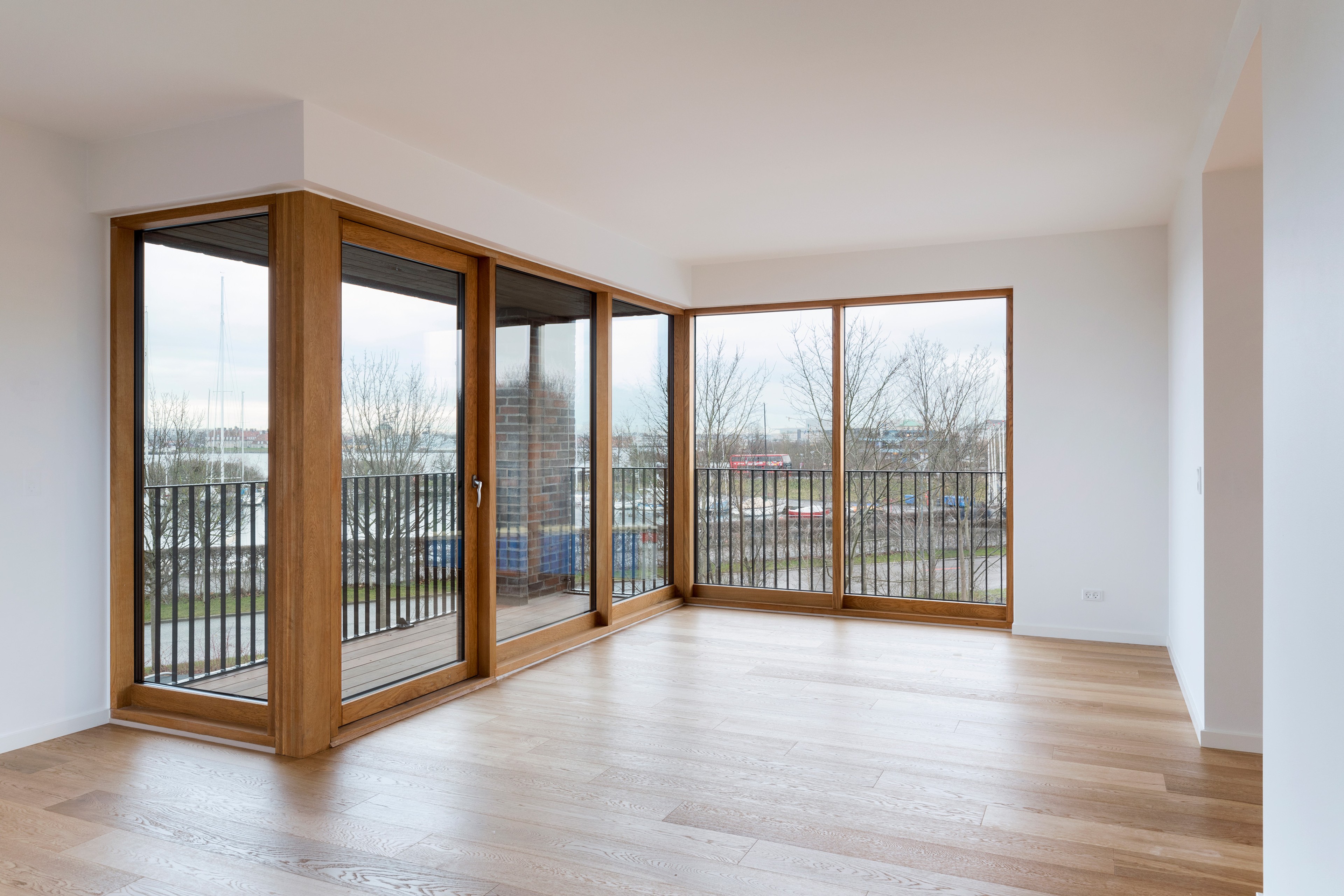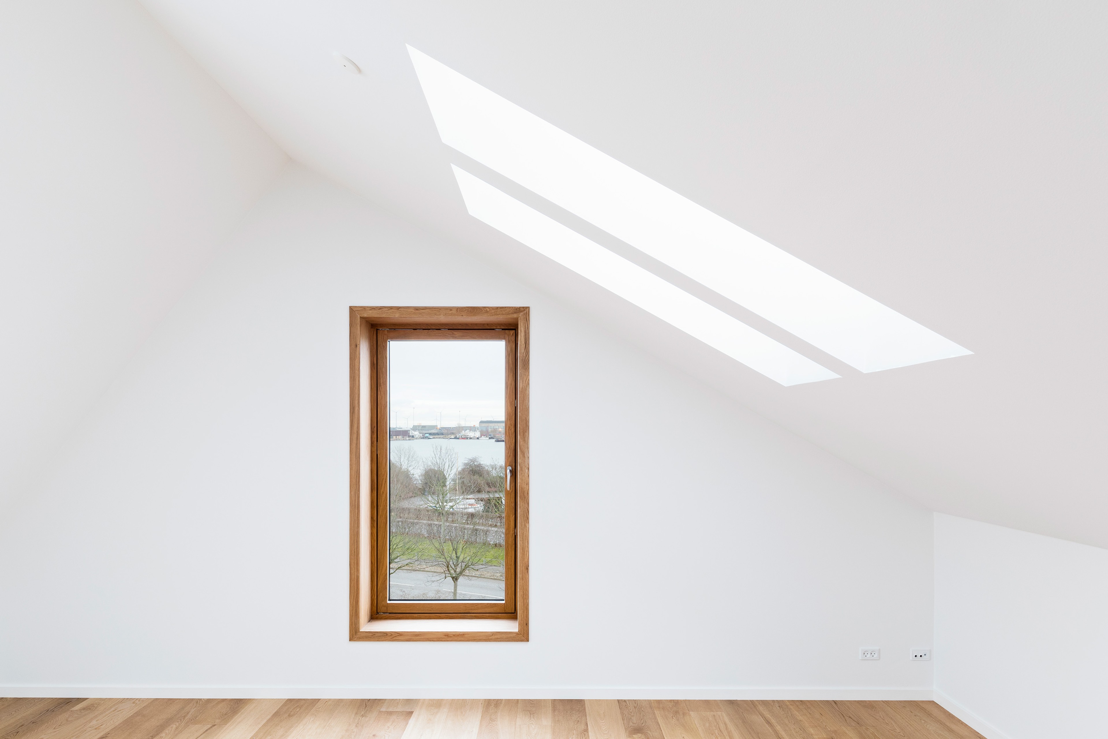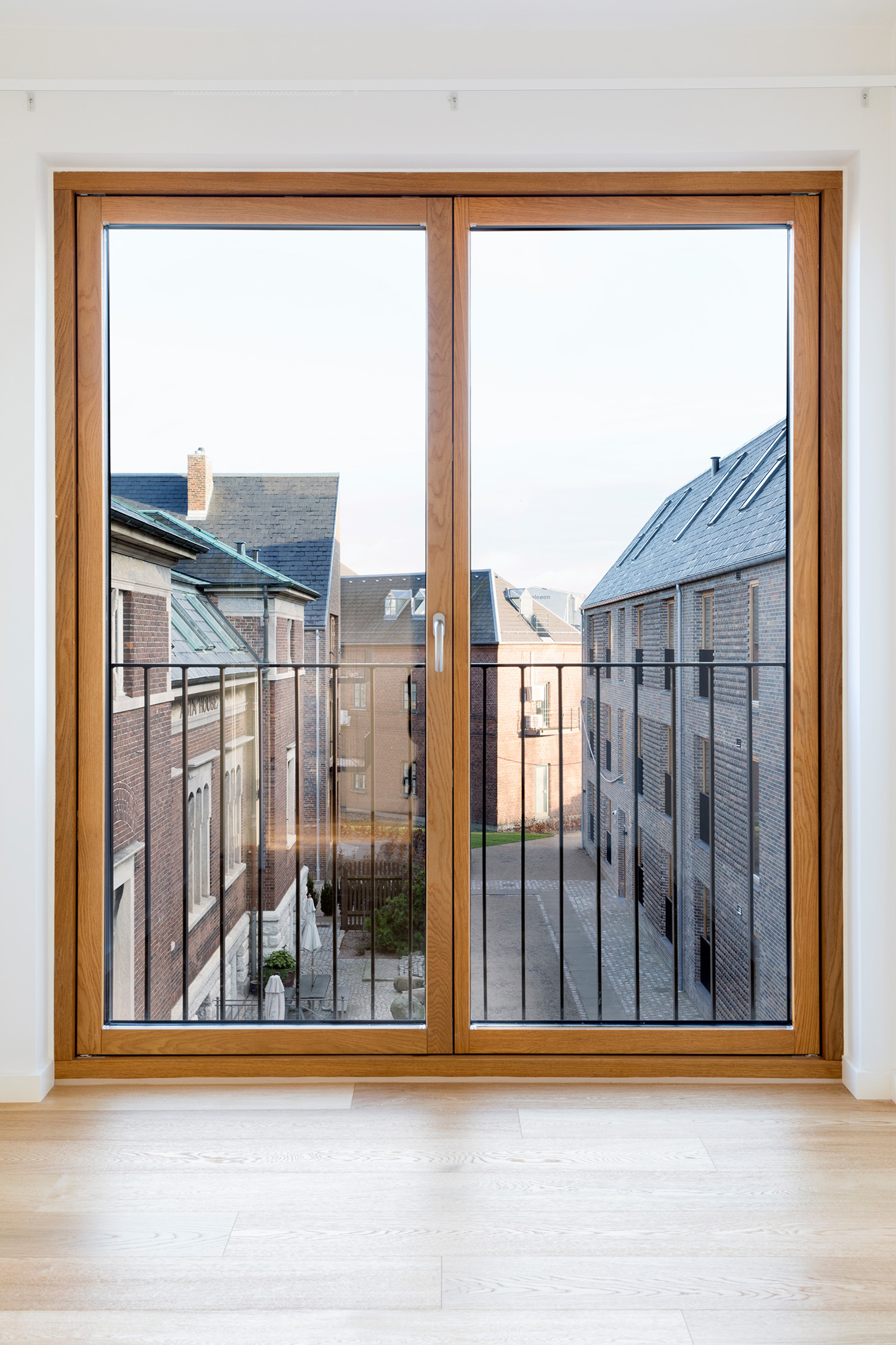 The project comprises two long building volumes and a standalone structure, housing 23 apartments of varying sizes. The façades incorporate smooth red brick, punctuated by patterned masonry inspired by nearby structures. Large oak-framed windows and balconies open the apartments to the city and harbour views, celebrating the location's unique maritime heritage while providing modern comfort.