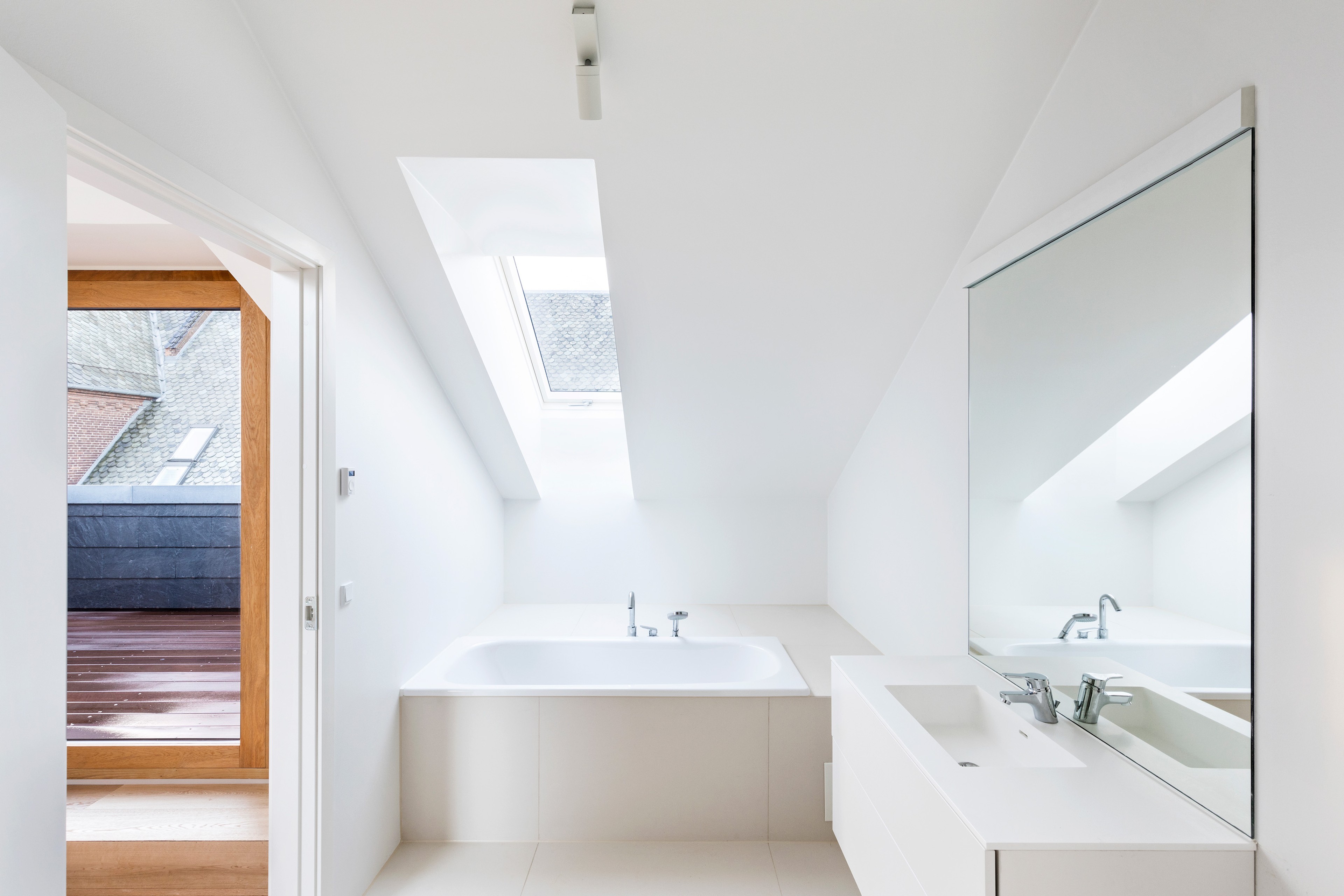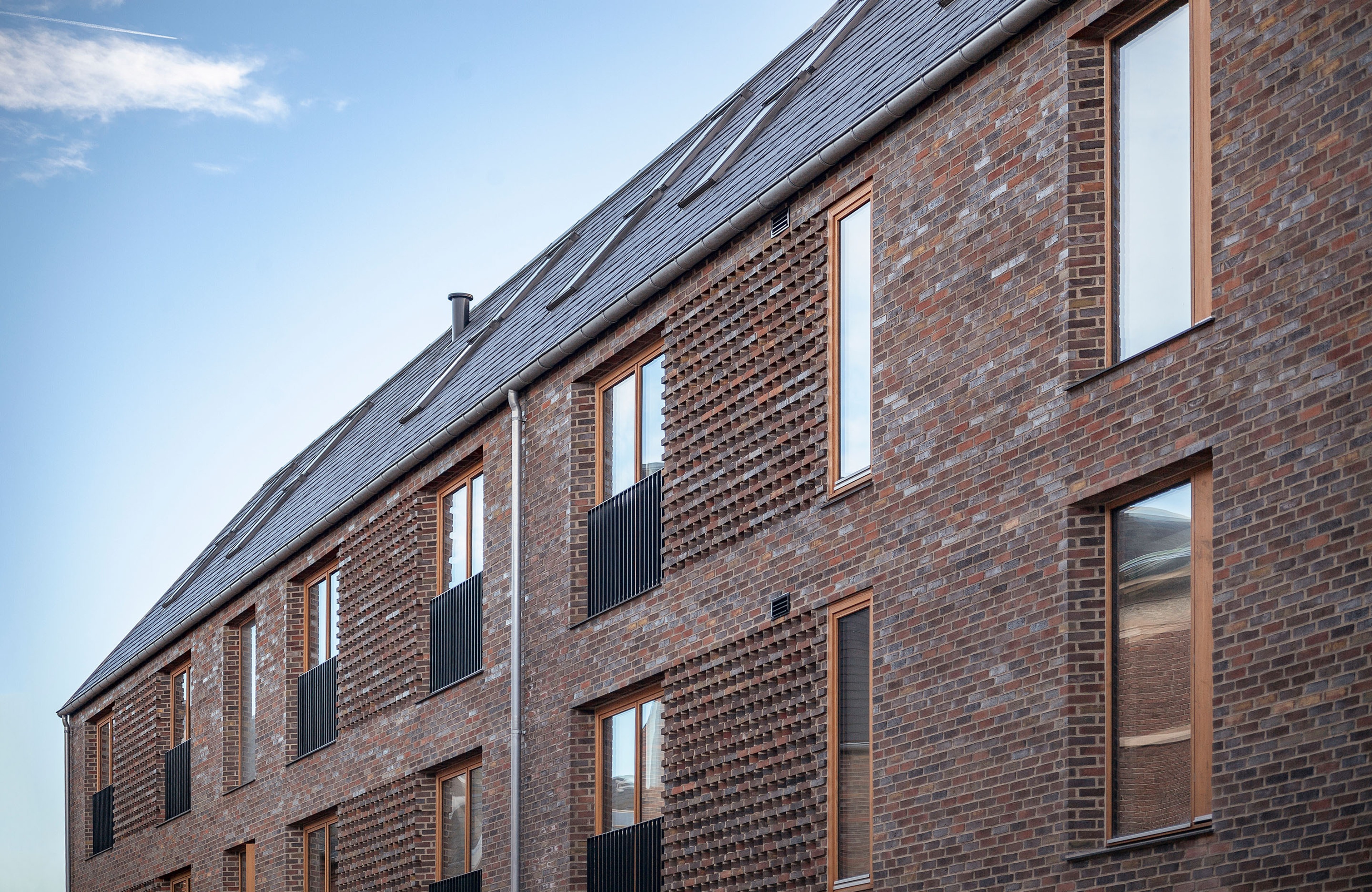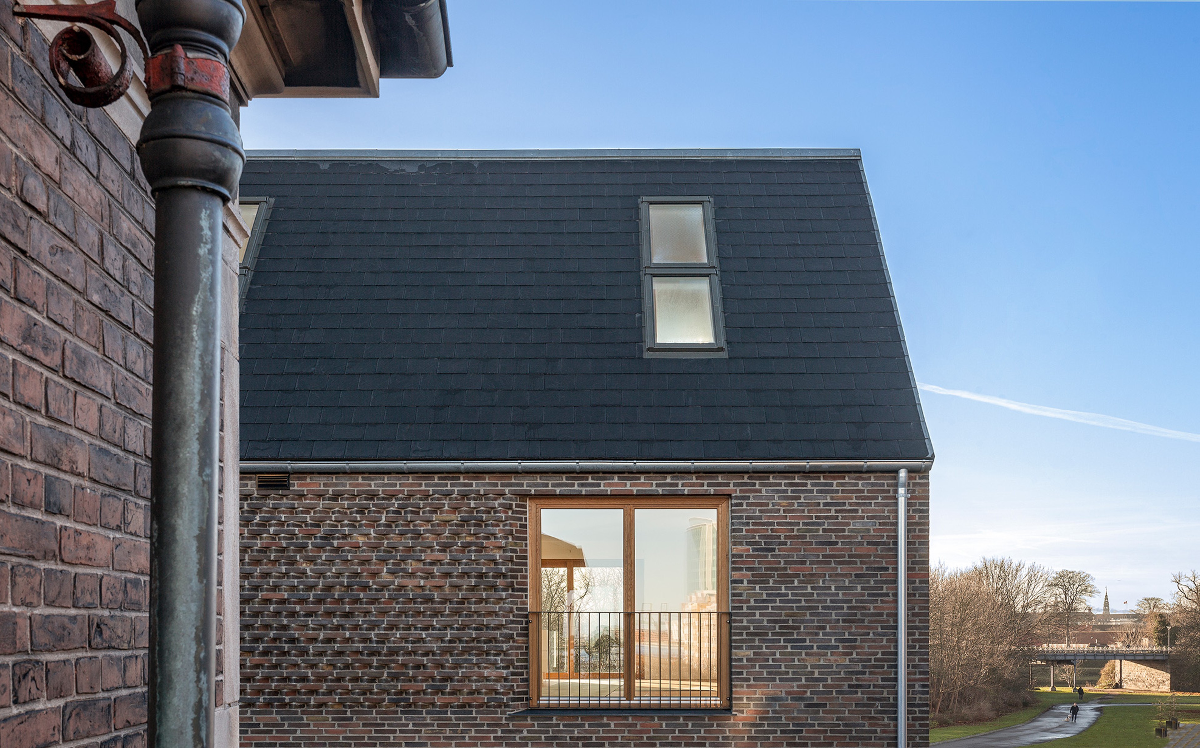 The surrounding architecture guided every design decision. The asymmetrical rooflines adapt to the scale of neighbouring buildings, and the material palette of red brick and slate blends seamlessly with the area’s historic aesthetic. By embracing the existing grid layout, the project connects visually and spatially to the surrounding streetscape and waterfront.