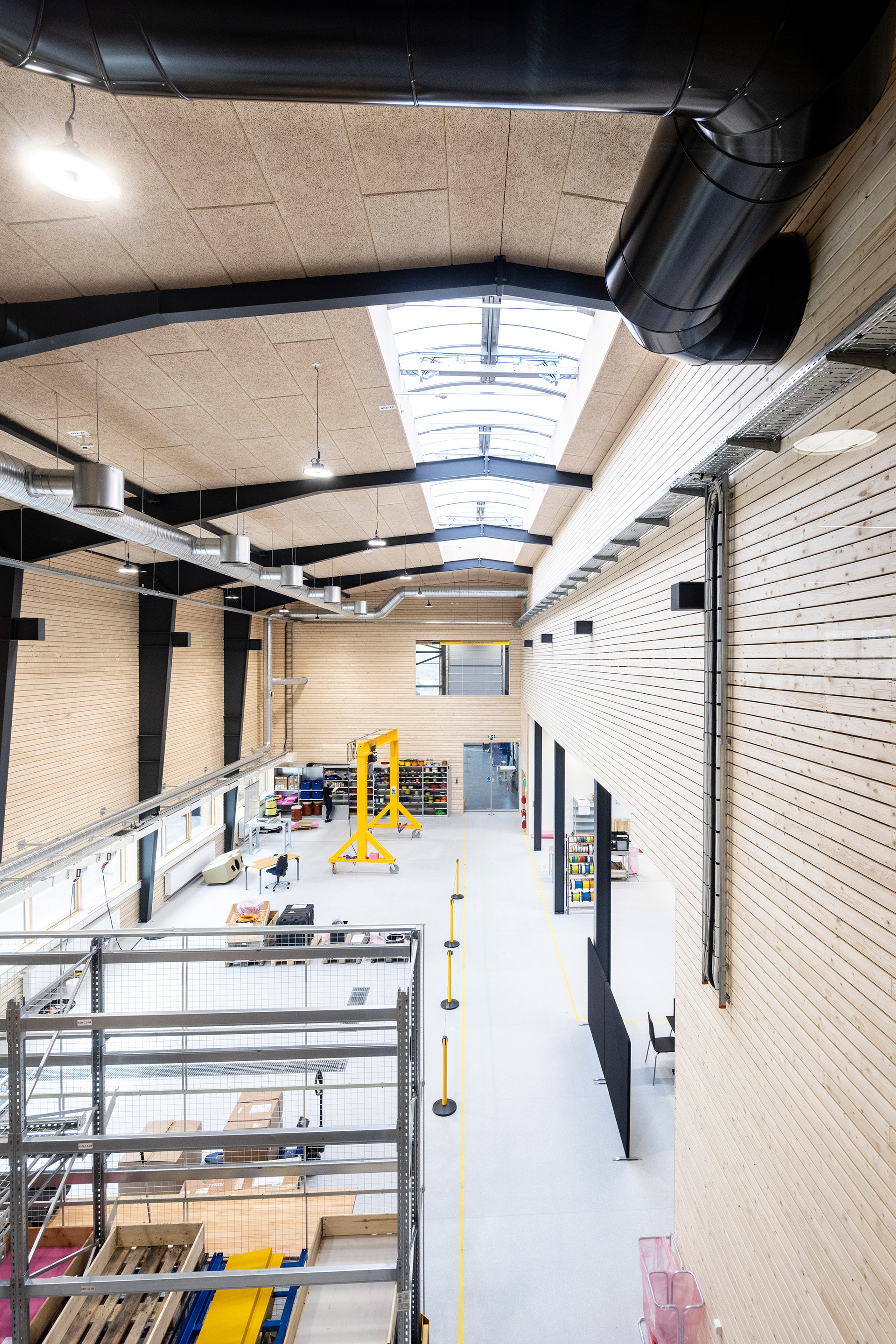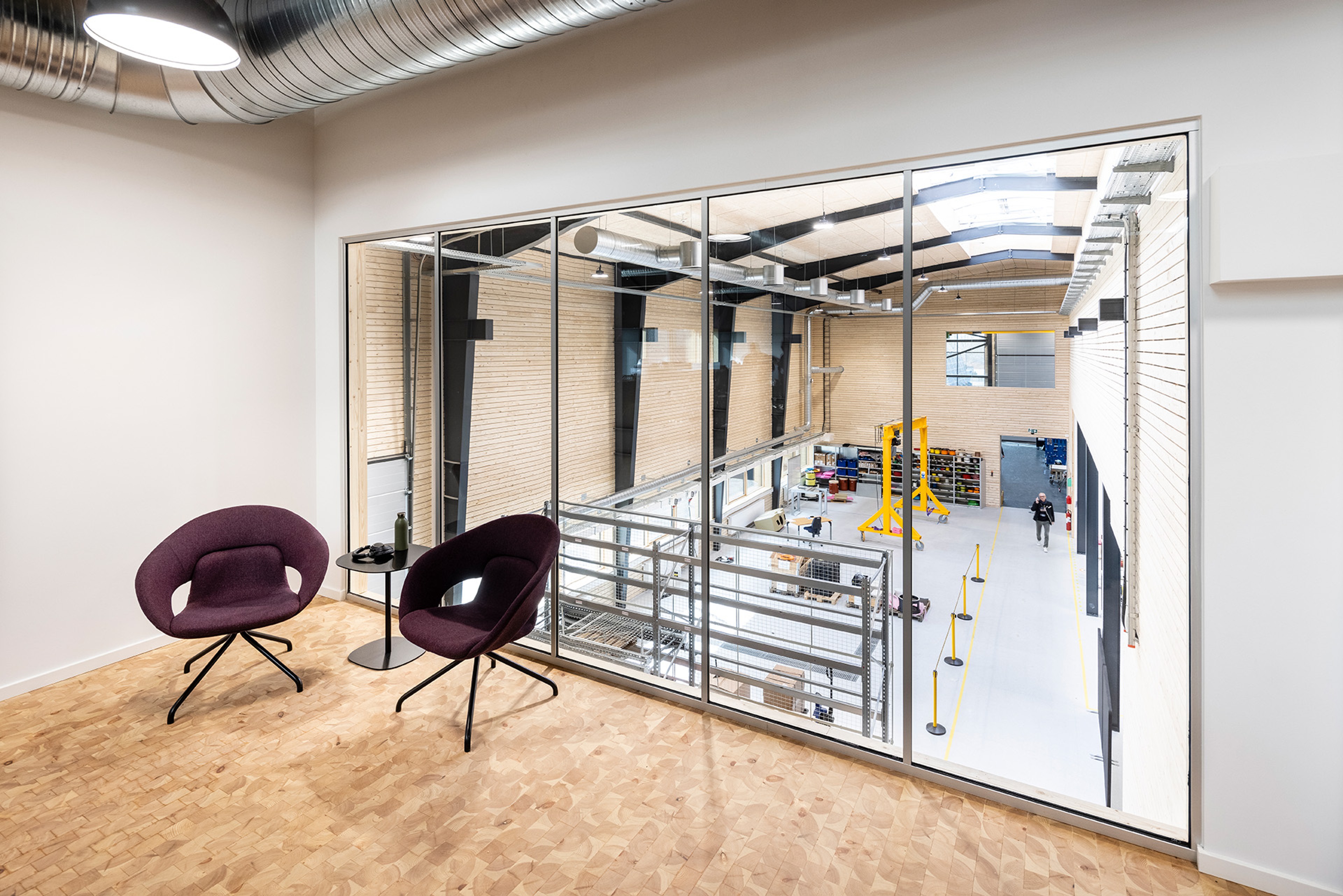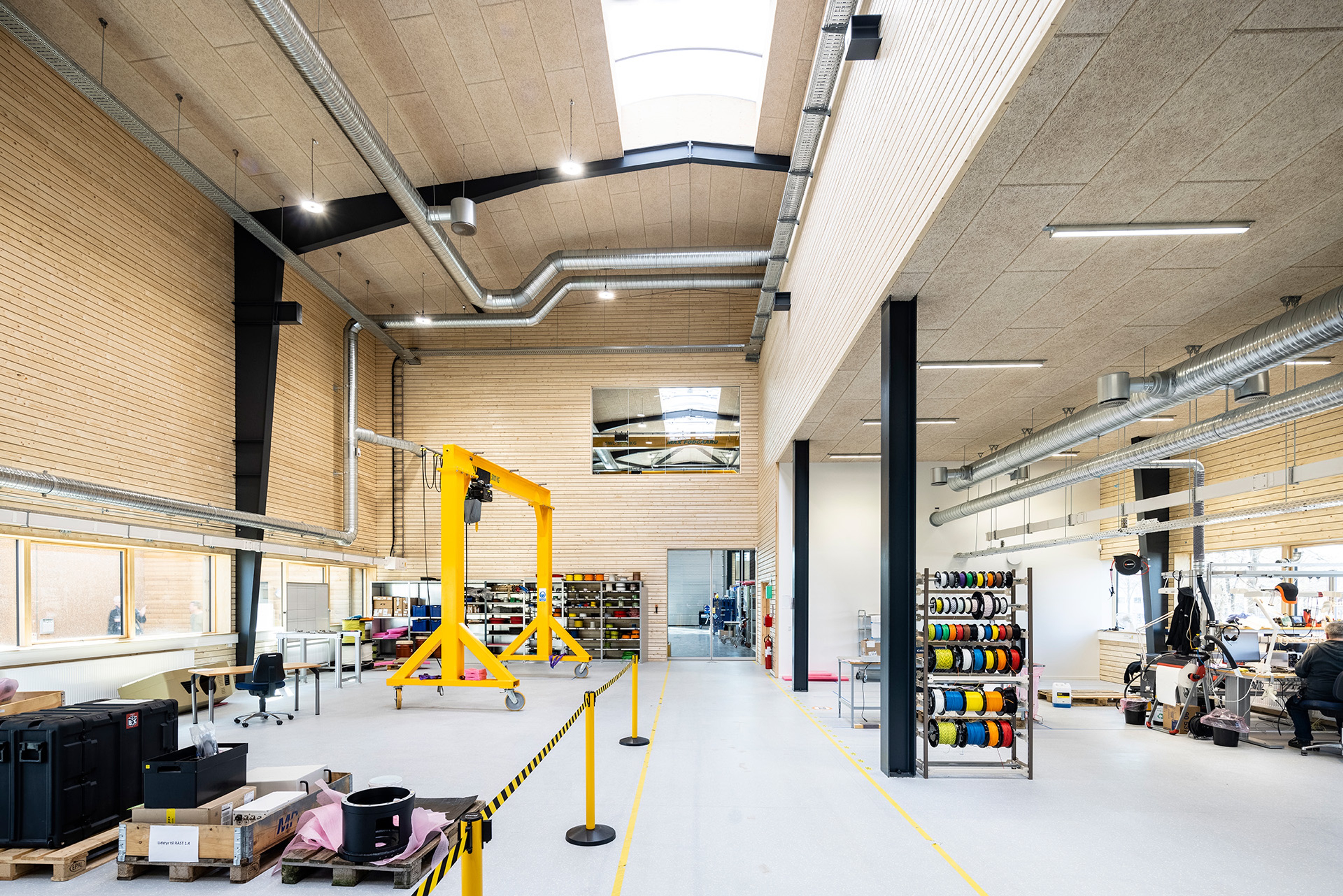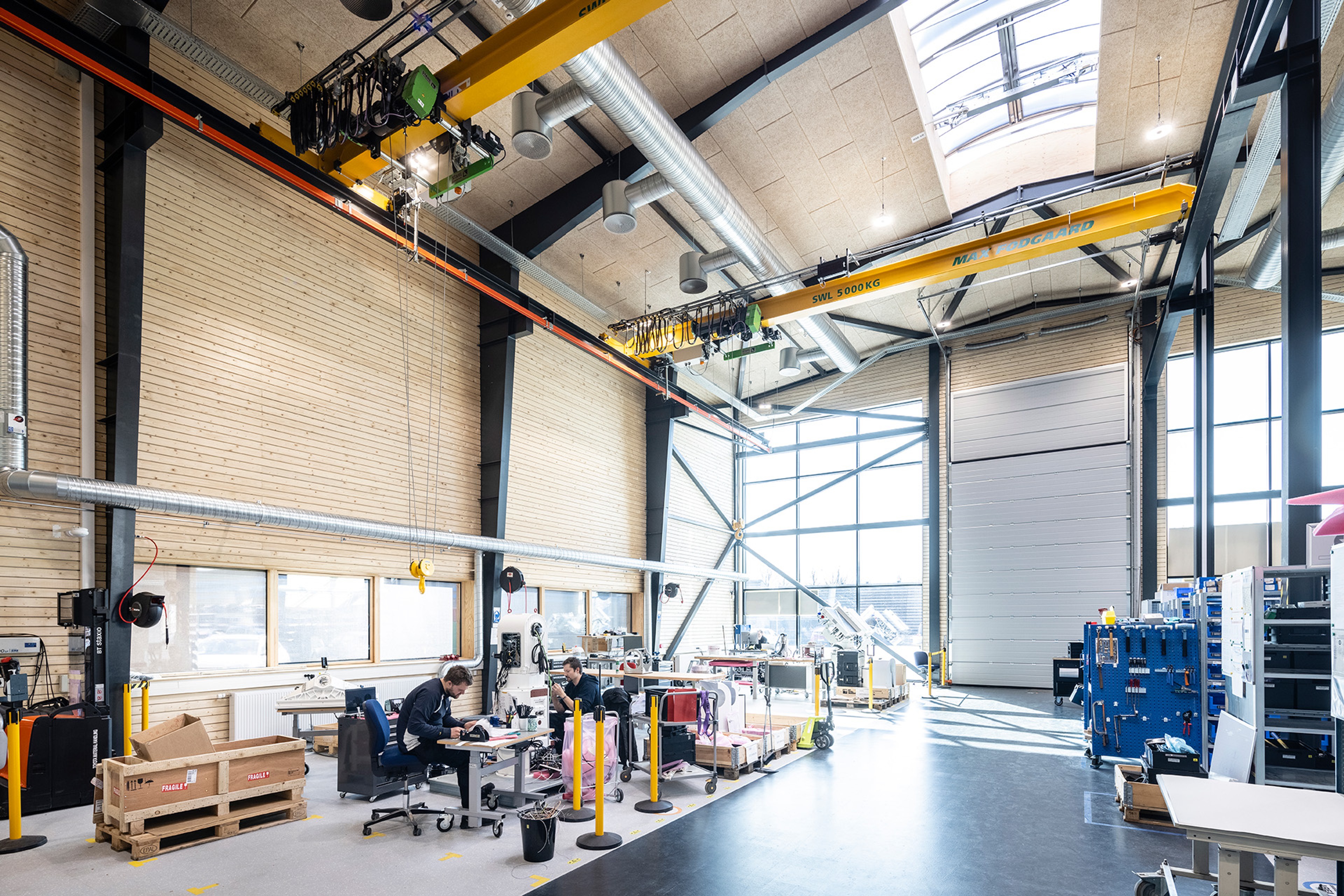 112A production company in the aerospace and defense industry, sought a building to bring development, production, and administration together under one roof. The design emphasizes integration and transparency, strengthening the connection between development and production. The building’s consistent use of wood on the façade, floors, and interior elements serves as a CO₂-reducing measure, while adding a sense of warmth and material coherence throughout.