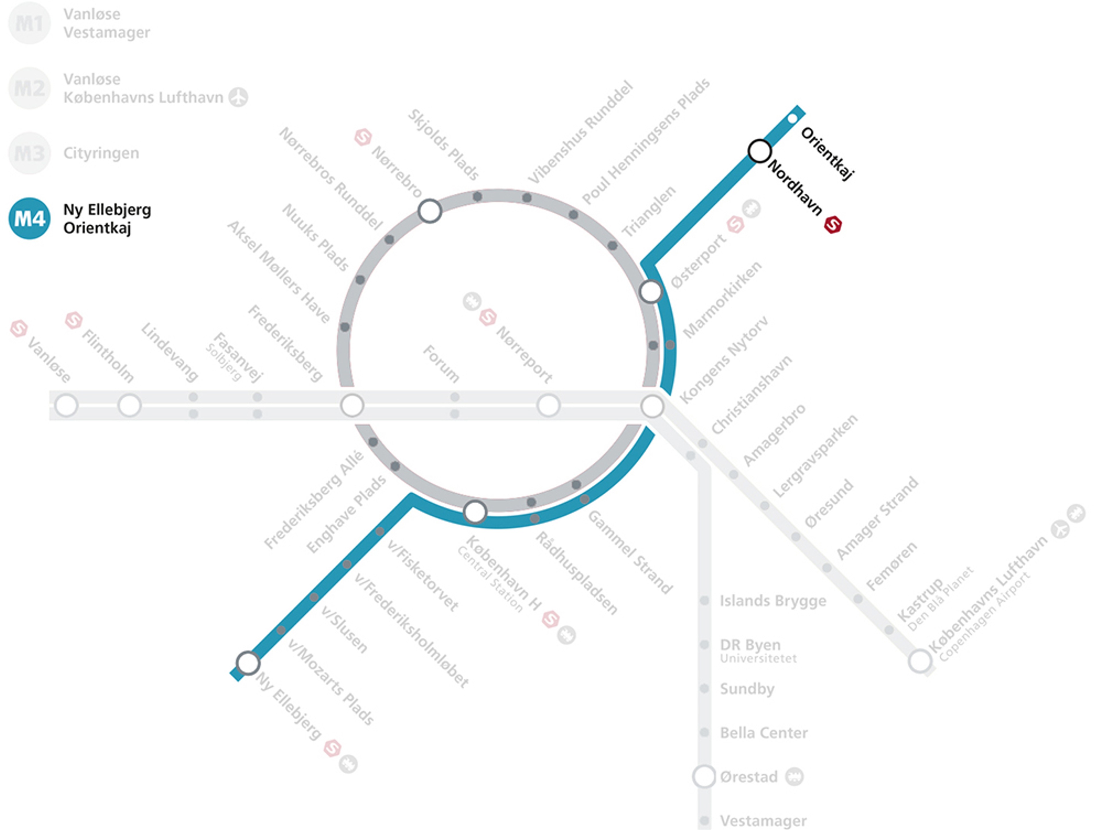 Two stations on the metro circle line´s branch off to the new sustainable city district, ‘Nordhavn’, makes it easy to change to the S-train, and gives potential for green areas.