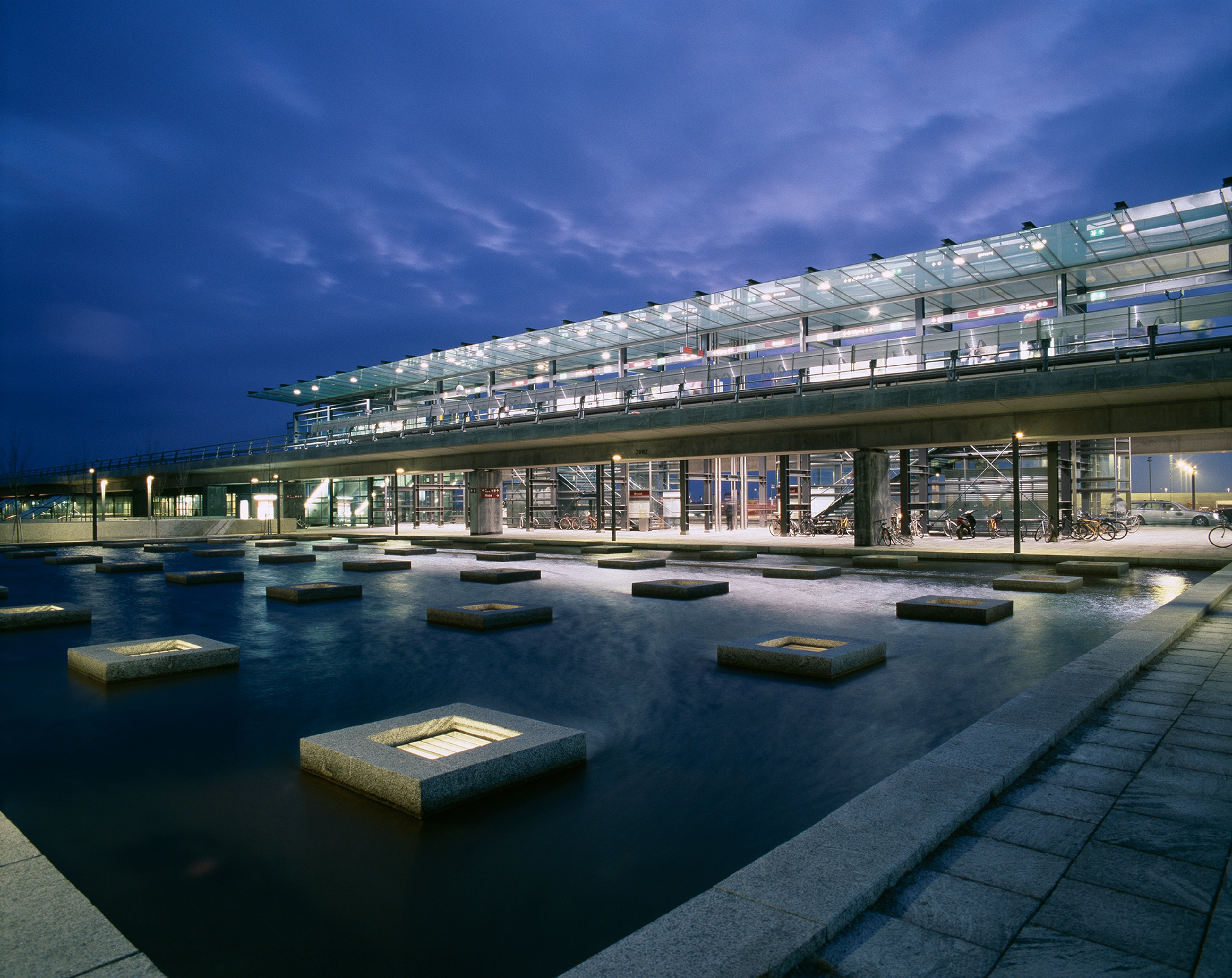 The five elevated metro stations in Ørestad are designed as light and transparent pavilions in steel and glass, seamlessly integrating the metro line into the urban landscape. These airy structures rise above the heavy concrete rail infrastructure, acting as “beacons of light” along the route. Large glass facades provide both shelter and openness, allowing passengers to stay protected while maintaining a clear visual connection to the cityscape. At night, the illuminated stations and reflective glass enhance the metro’s presence as a vital part of the city. The flexible design ensures each station adapts harmoniously to its specific surroundings, preserving natural topography and access points. PLH led the design, planning, and execution of these distinctive stations, creating a metro experience that is both functional and visually striking.