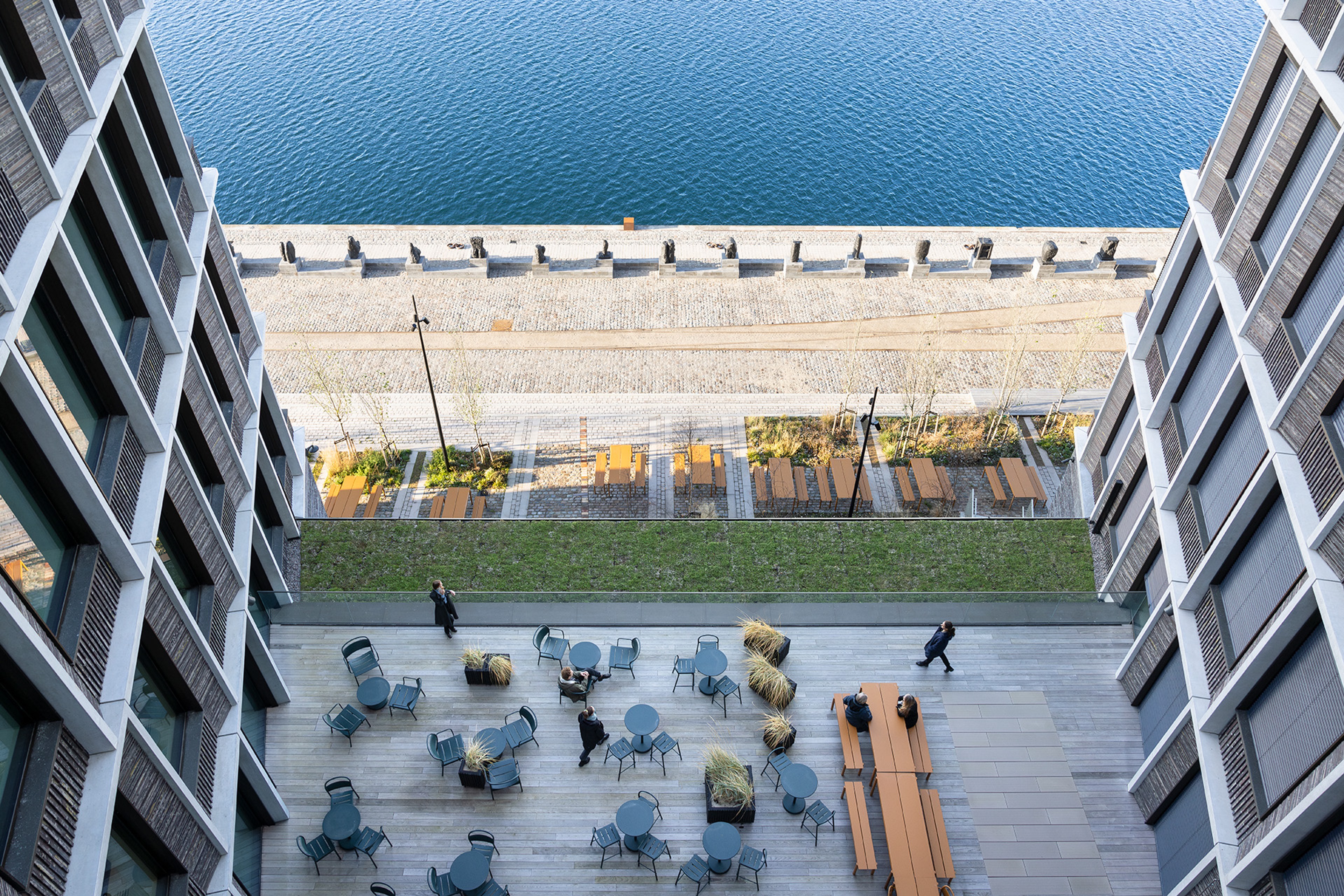 The six-story headquarters is organized as a comb-shaped structure with a unifying atrium at its heart. Work zones are designed for adaptability and focus, while balconies, cafés and quiet areas provide inspiration and pause. A public café and flexible salons open up to the waterfront and neighboring park, anchoring the building in its urban context.