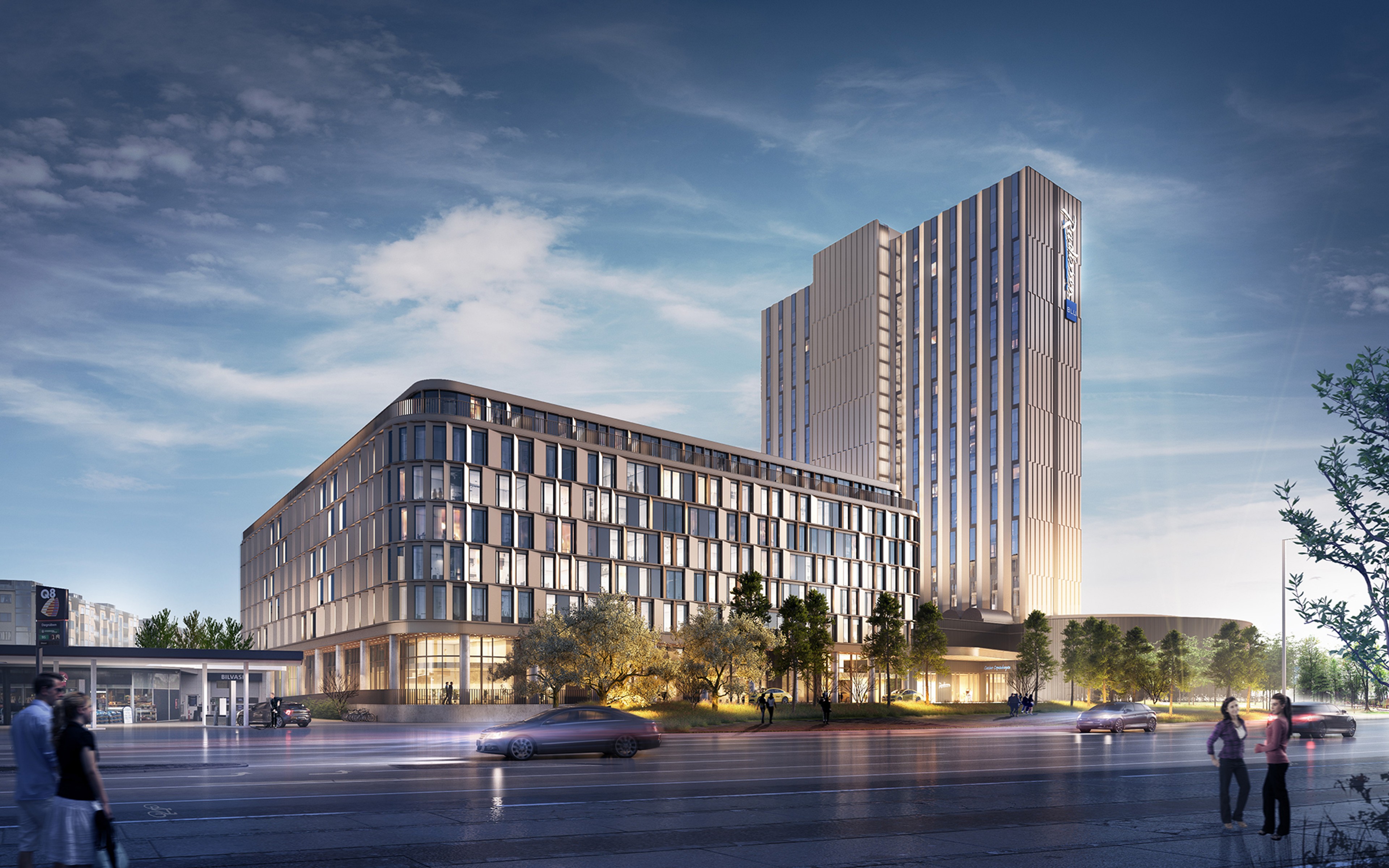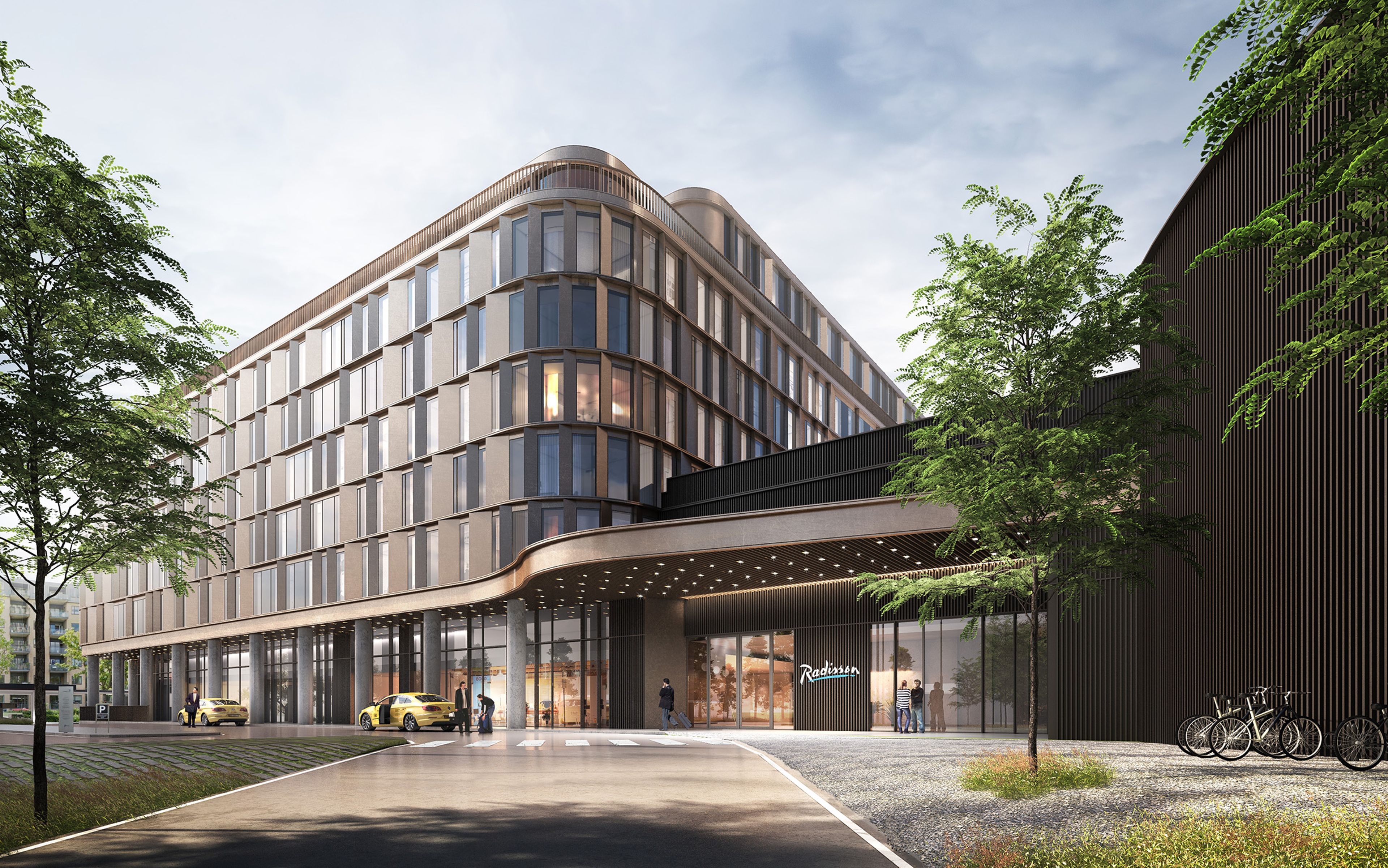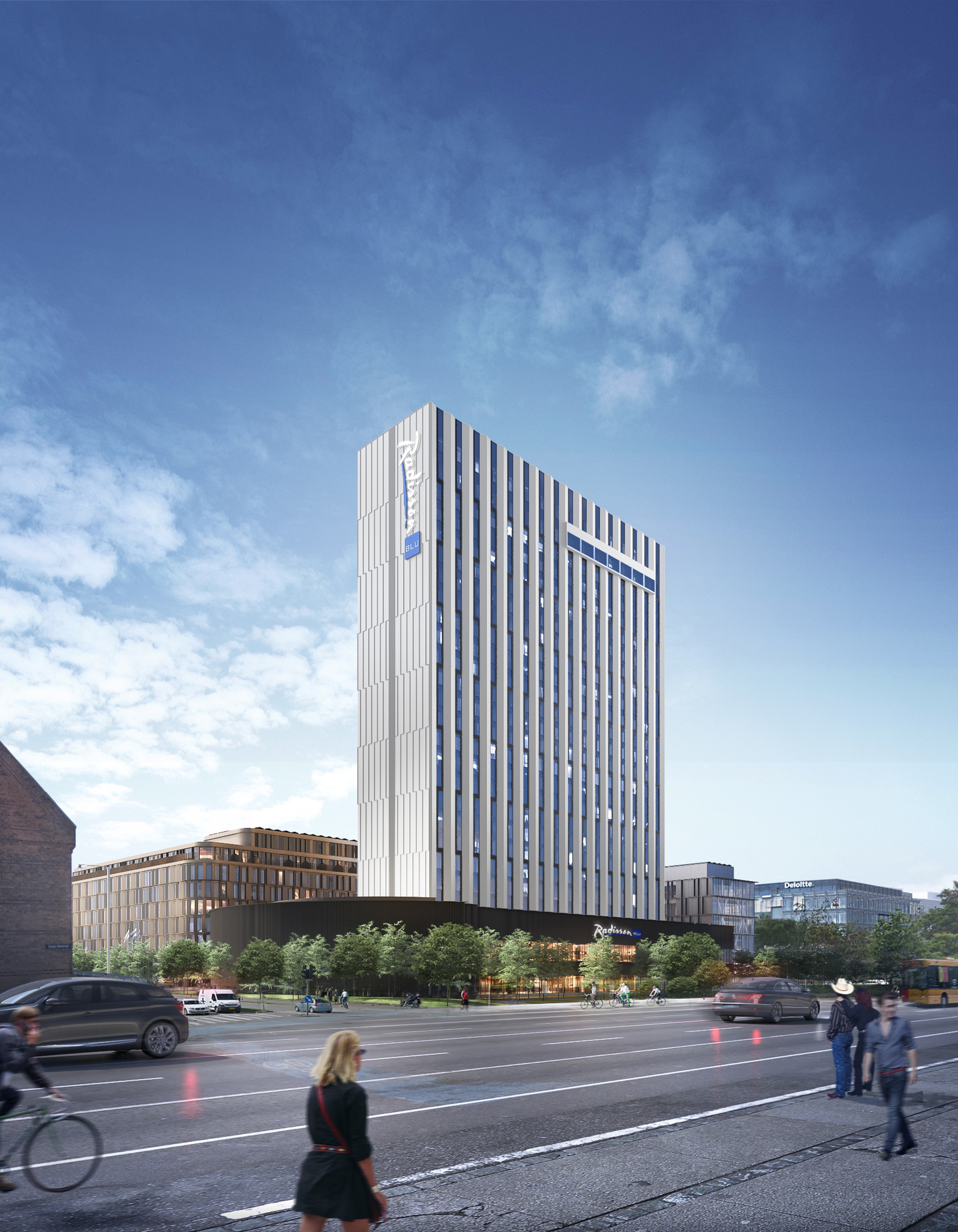 The extension of the Radisson Blu Scandinavia Hotel will enhance its capacity by adding over 400 new hotel apartments, public shops and cafés. It also includes a multi-user building and a public park with more than 100 trees. The aim is to create a welcoming and accessible space, with facilities such as an integrated kindergarten and a transparent ground floor. By relocating parking underground and removing the current fence, the hotel will be more integrated into the surrounding area. The new park and green spaces will provide both hotel guests and local residents with a peaceful retreat from the busy streets, enhancing the area's liveability. The extension is designed to harmonise with the existing surroundings while promoting a vibrant public space. The new extension will cover 25,000 – 26,500 m², the kindergarten approx. 1,500 m² and the multi-user building approx. 10,000 m².