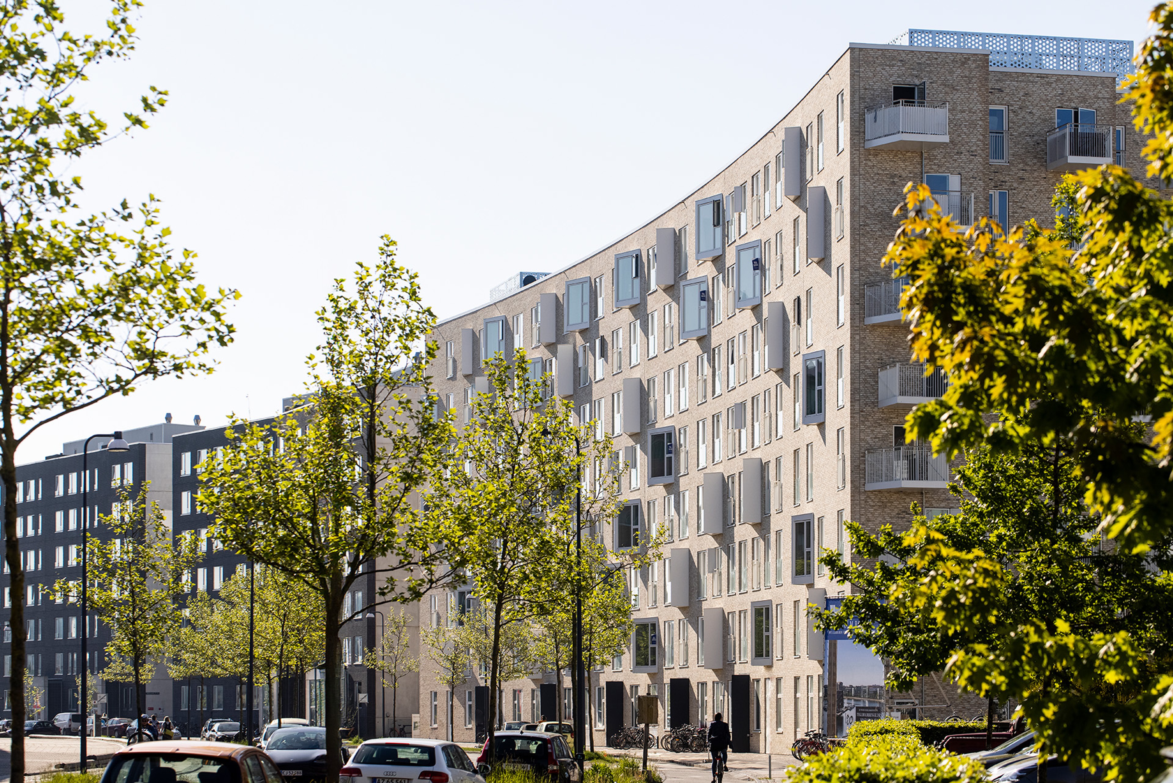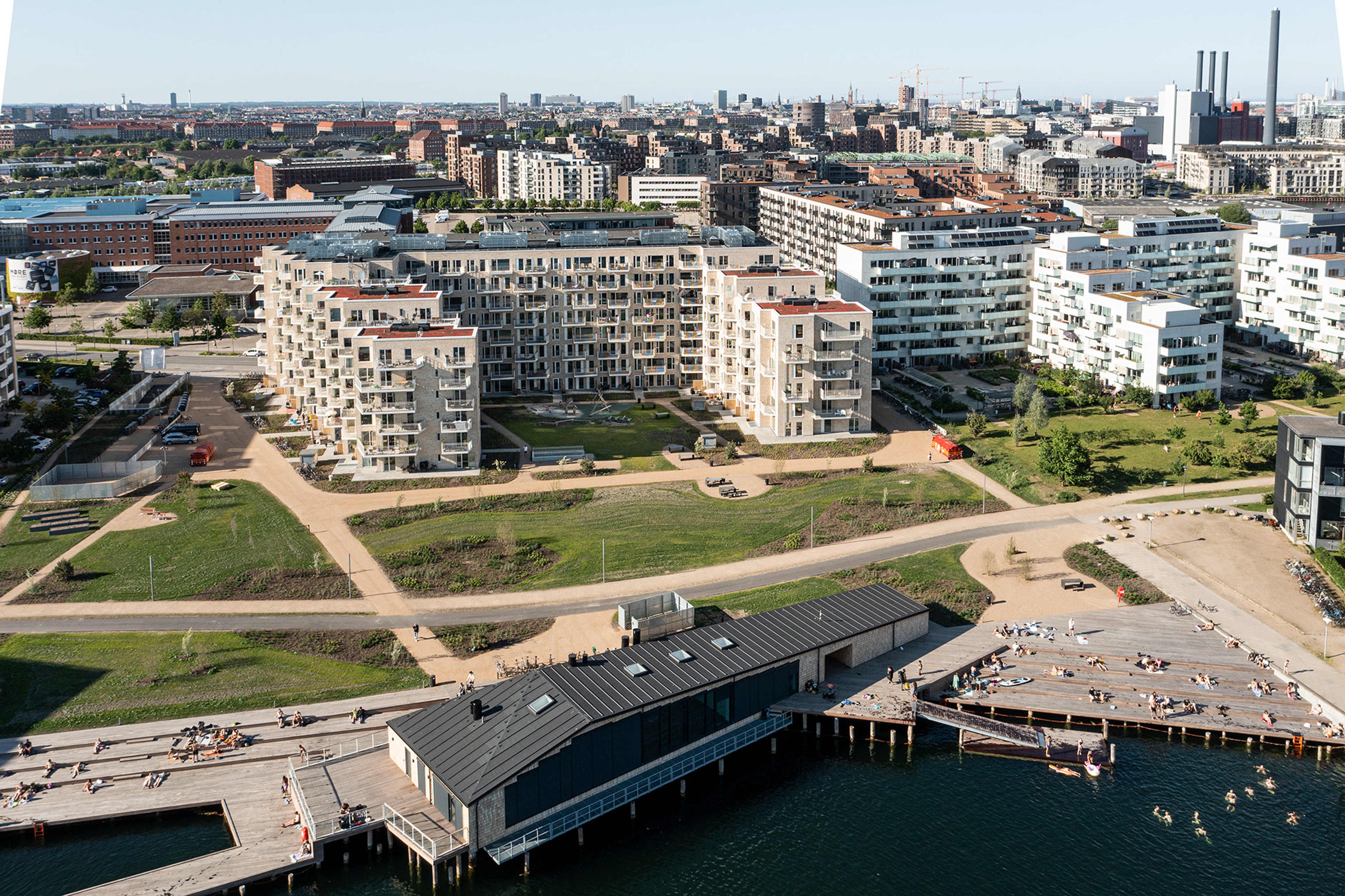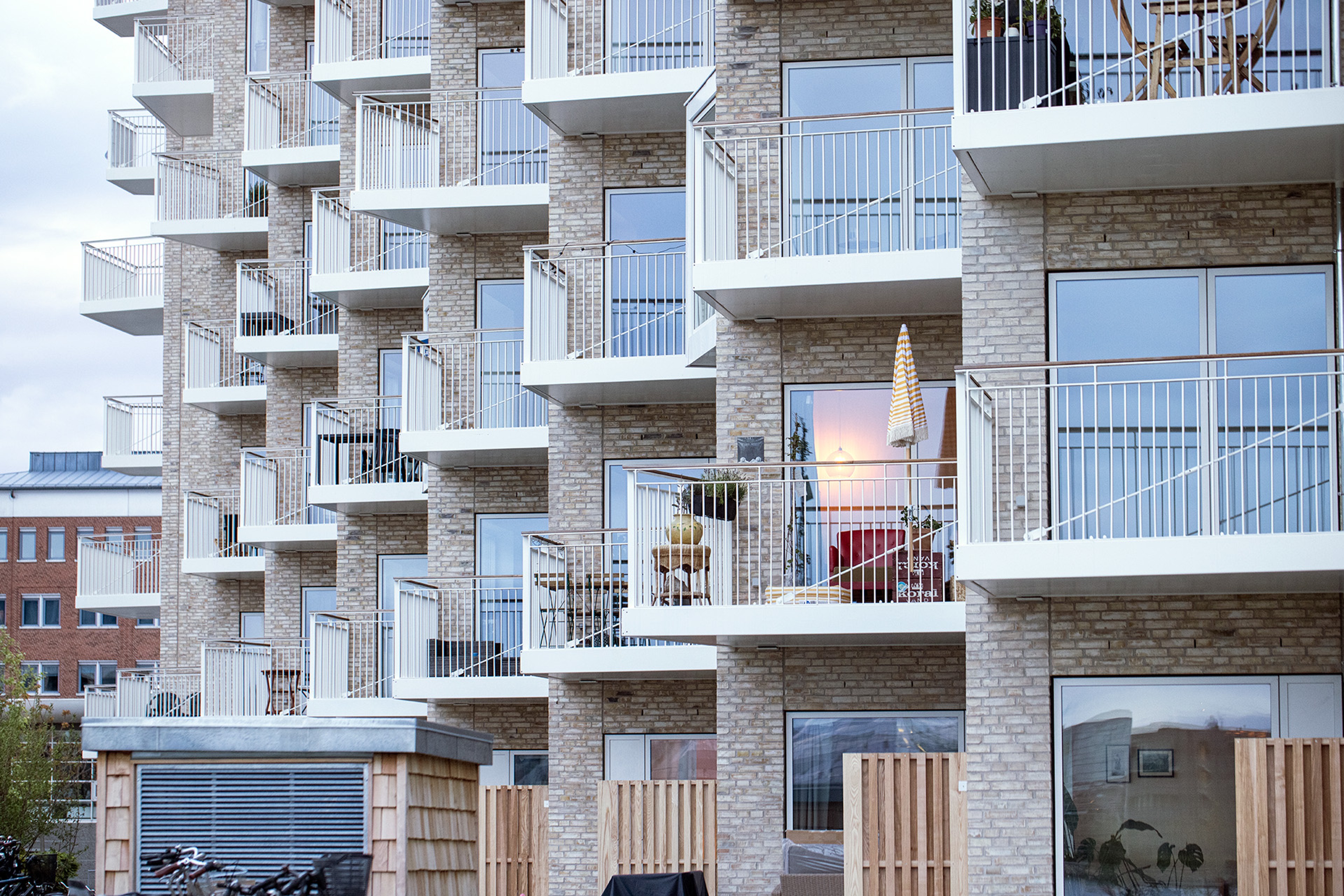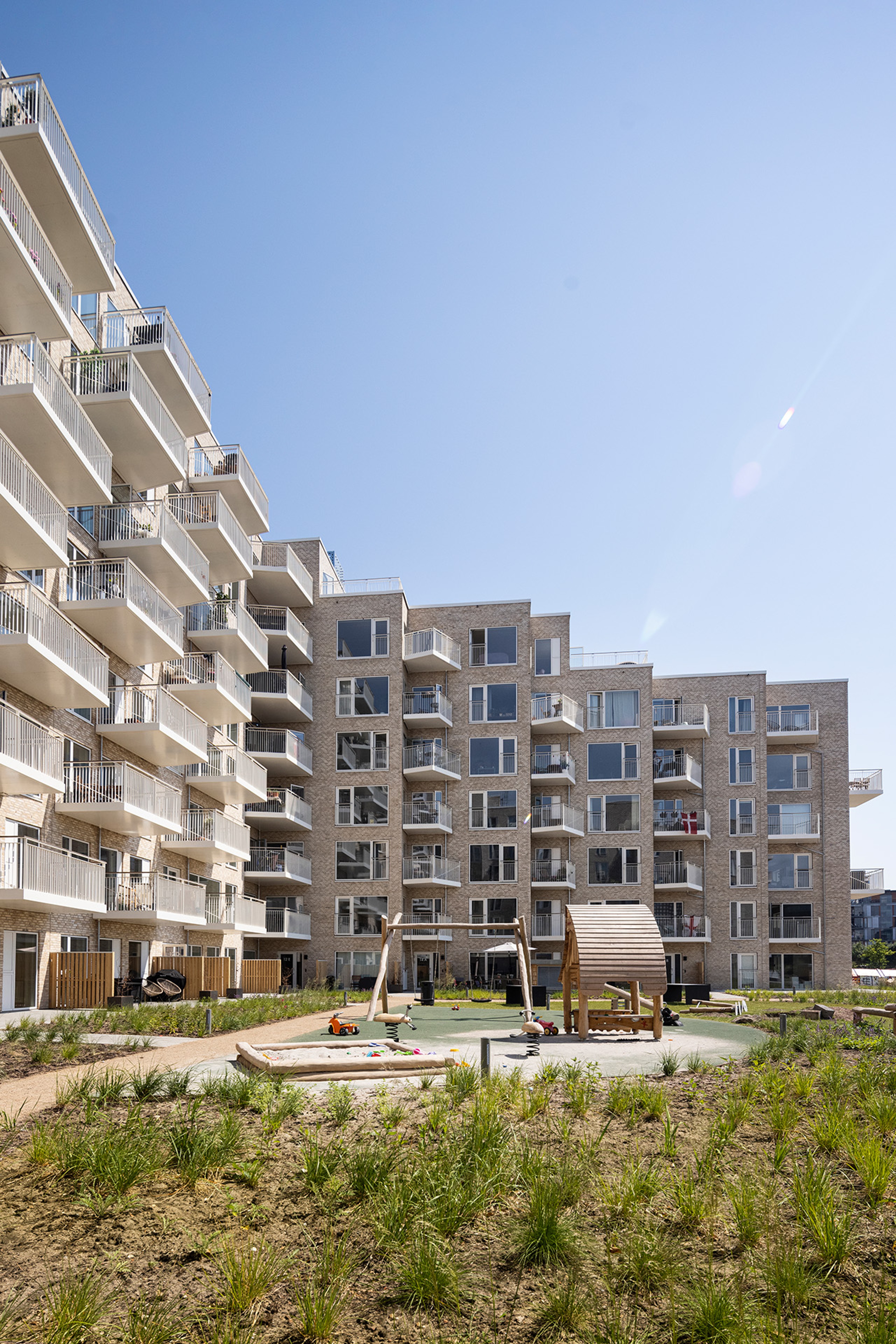 To enhance daylight and sightlines, an open courtyard surrounded by eight terraced levels was developed. The façade features light brick and expansive floor-to-ceiling windows. Key amenities, including a playground, grill area, and cycle route, encourage an active lifestyle and encourage social engagement. In the spirit of fostering community connection, a harbour pier got established at Teglværkshavnen. Both residents and the city's citizens can use the habour bath.