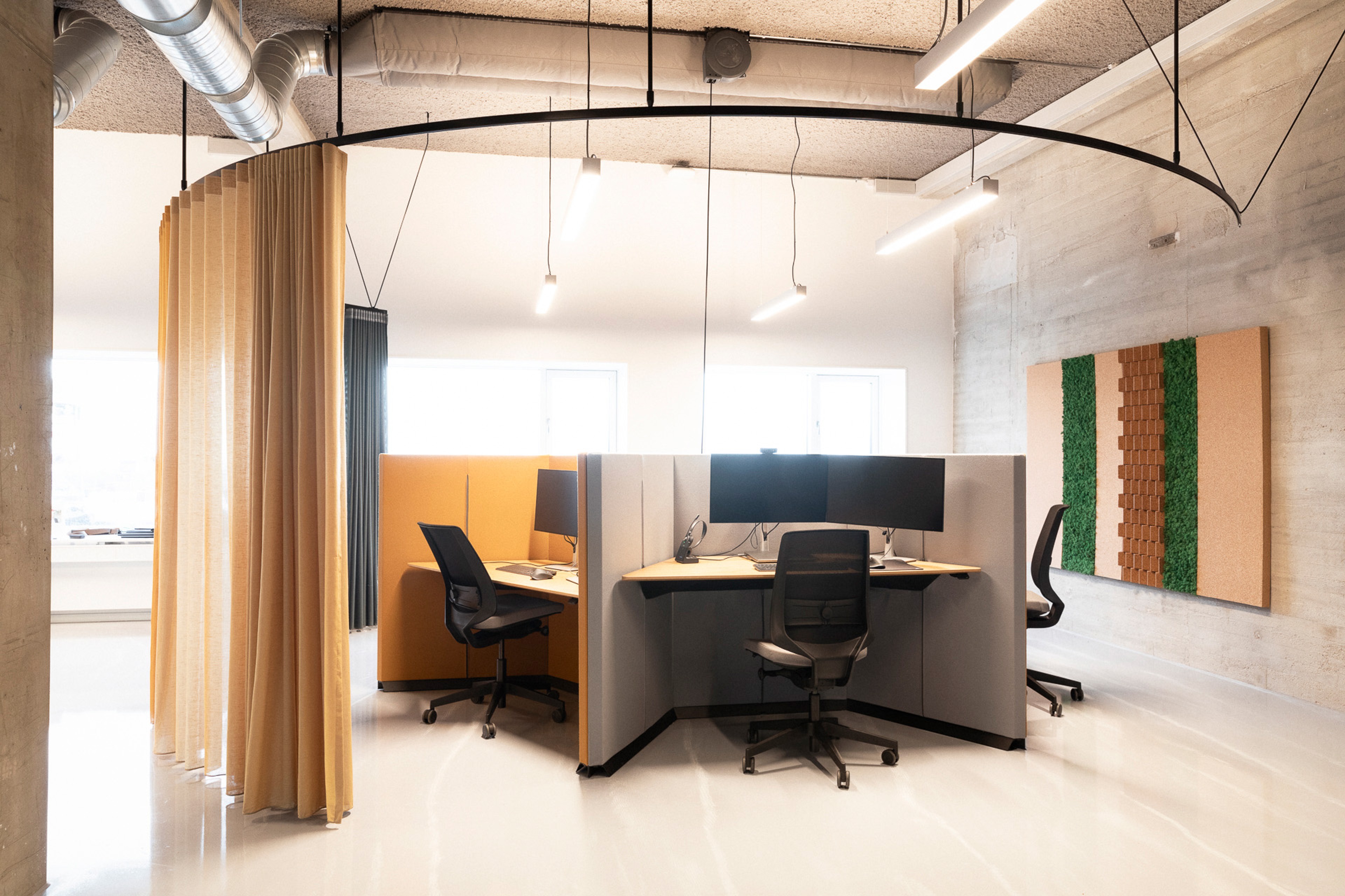 By delving into twoday’s identity and understanding the diversity among its employees, it became clear that the design needed to reflect values such as innovation, flexibility, and community. The building, a former warehouse transformed to office space, inspired a design rooted in contrasts – a strategy that respected its historical character while embedding twoday’s visual identity and visionary mindset.