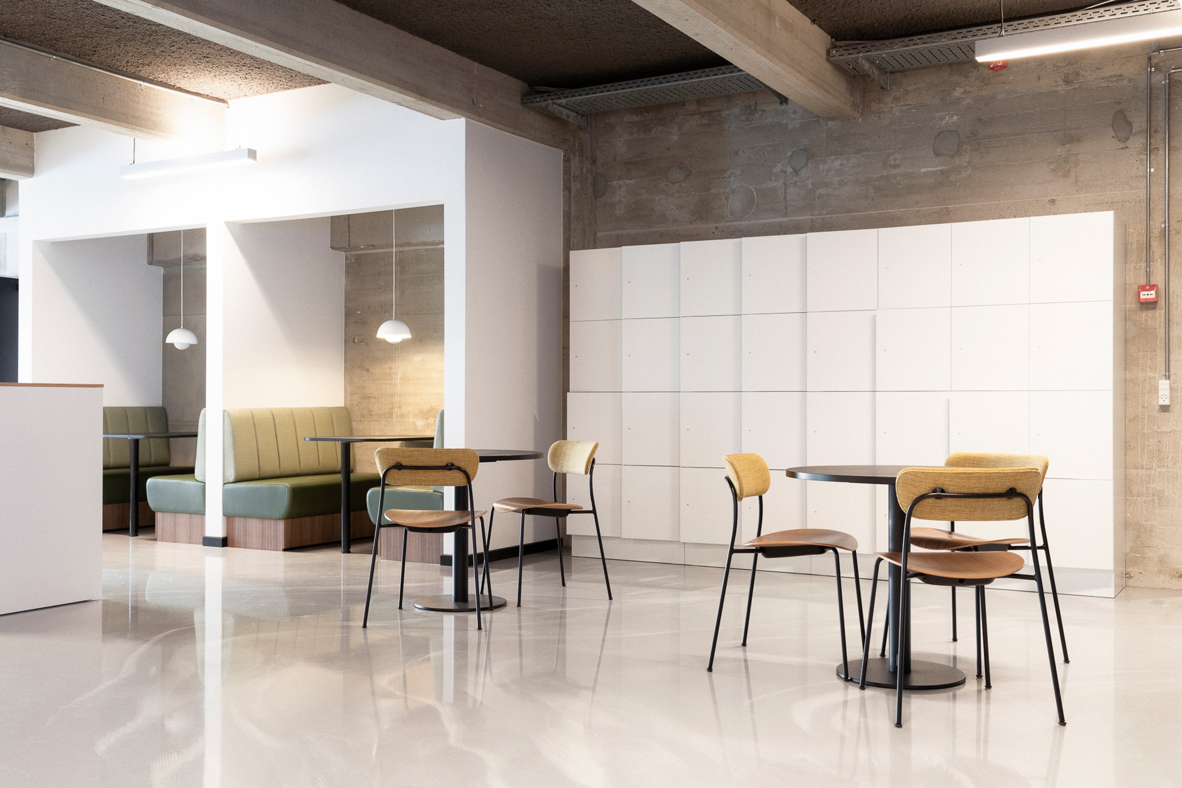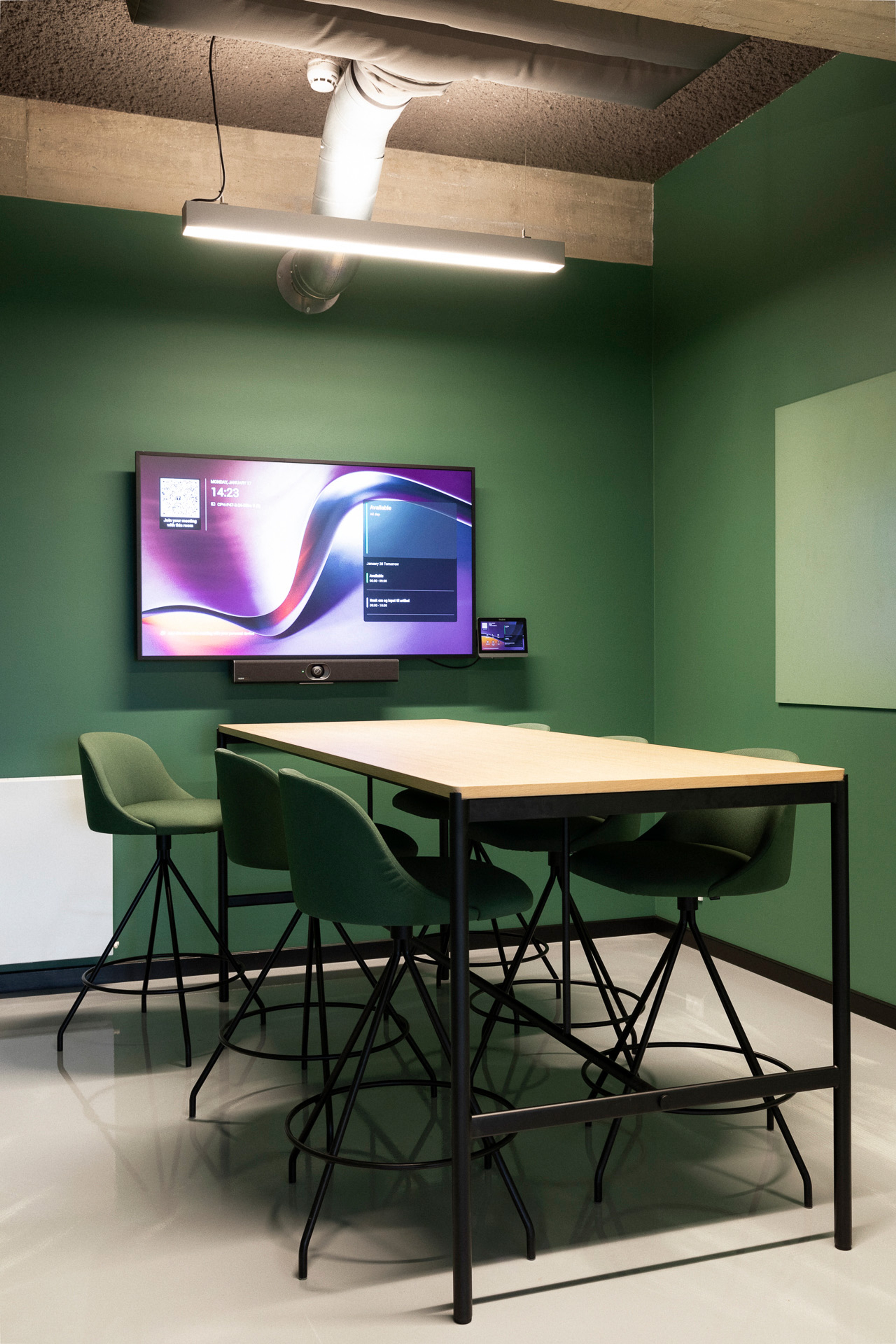 Materials such as oak, galvanised steel, and vibrant accents create a balance between the raw and the refined. The design is further enhanced with visual elements that reinforce twoday’s brand identity, including graphics, colors, and high-quality furniture.