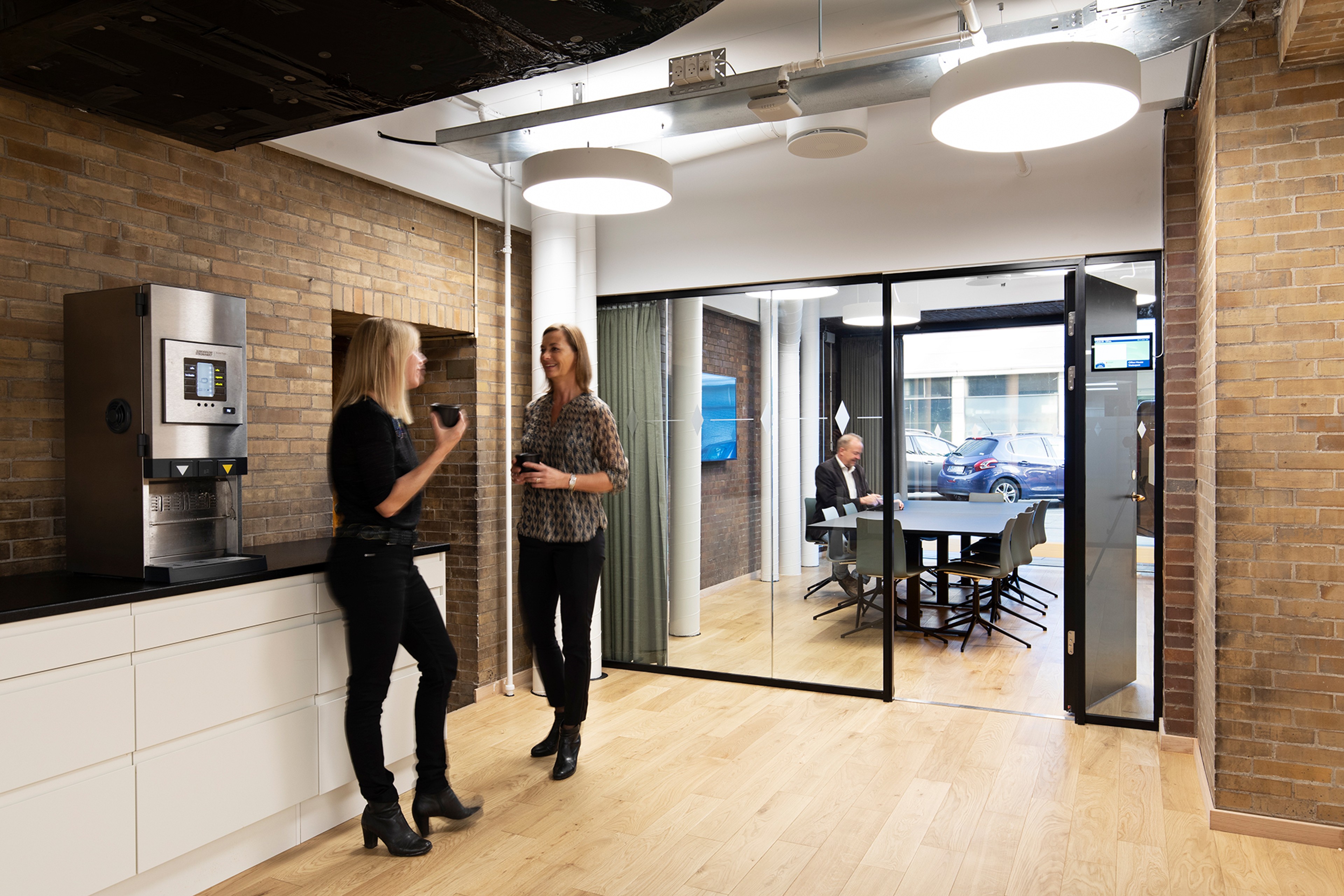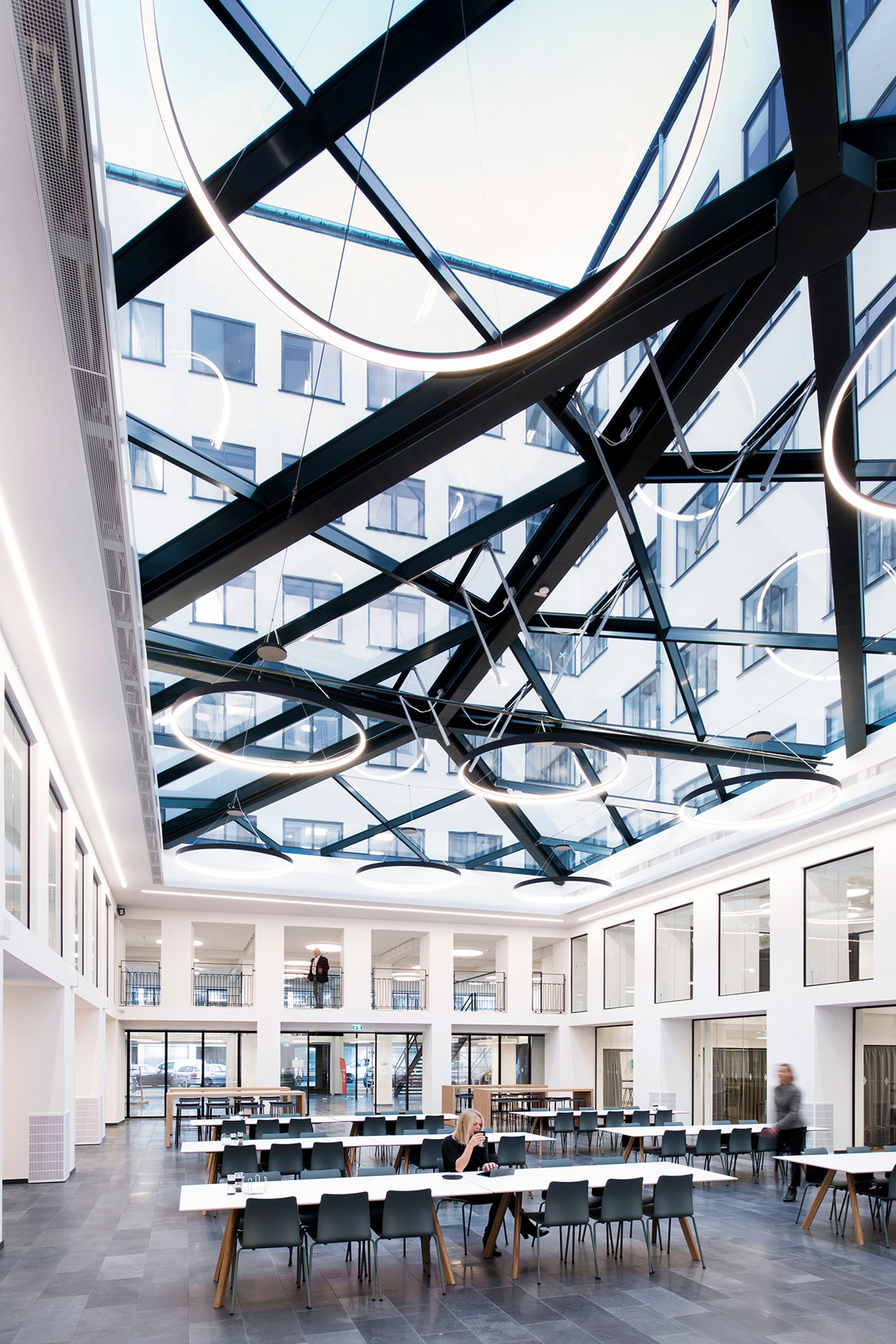 The renovation introduced the Office House – a central atrium and ground floor with amenities like a cafeteria and meeting facilities. This space is now a bright, open area with a glass-covered atrium providing a direct view of the sky. The redesign included flexible office layouts on upper floors, creating open and well-lit workspaces.